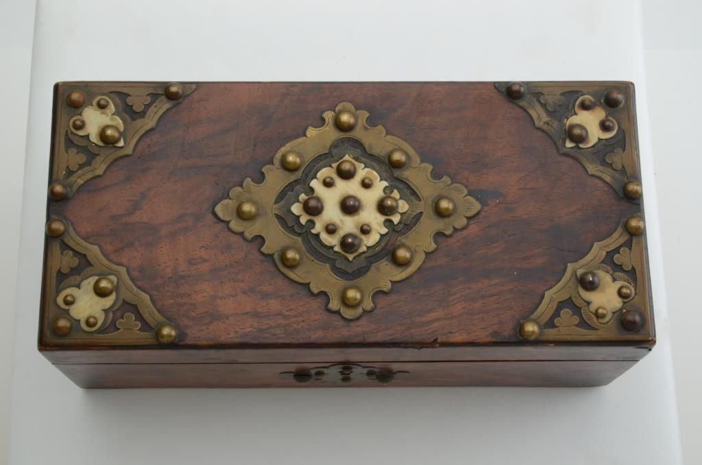 Antique wood vanity box approx. 10” x 5” x 4” displaying fine graining with brass and bone decorative work; overall good condition. Est.: $100-$150.