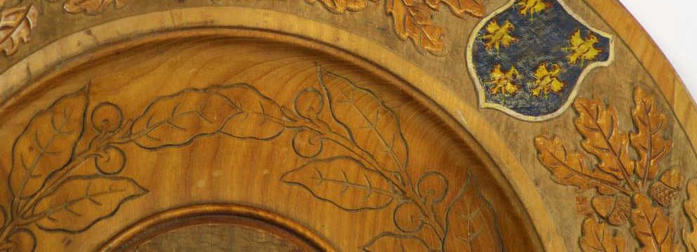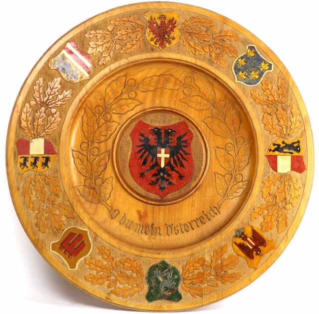 Antique wooden round plaque with various crests around perimeter and center, 16" diameter.