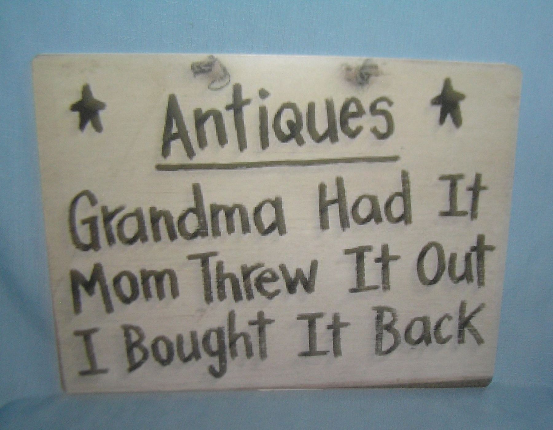 "Antiques Grandma had it, Mom threw it out, I bought it back" retro style advertising sign printed on PVC hard board these signs are auctioned for there decorative and display purposes 12x16 est. value $50.00-$60.00