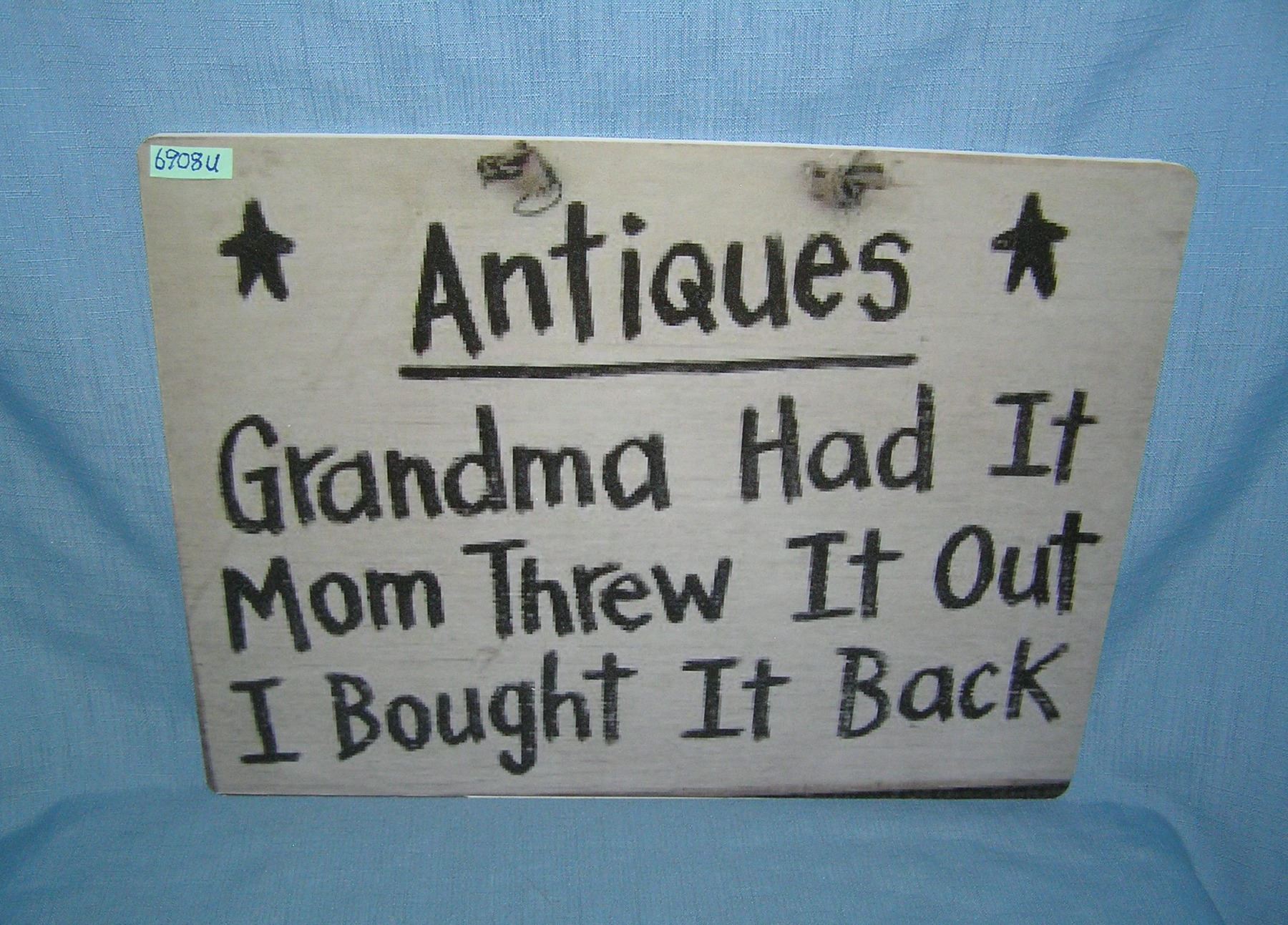 Antiques Grandma had it Mom threw it out I bought it back retro style advertising sign printed on PVC hardboard these signs are auctioned for their decorative and display purposes 12 inches by 16 inches est. value $40.00-$50.00