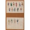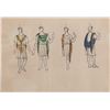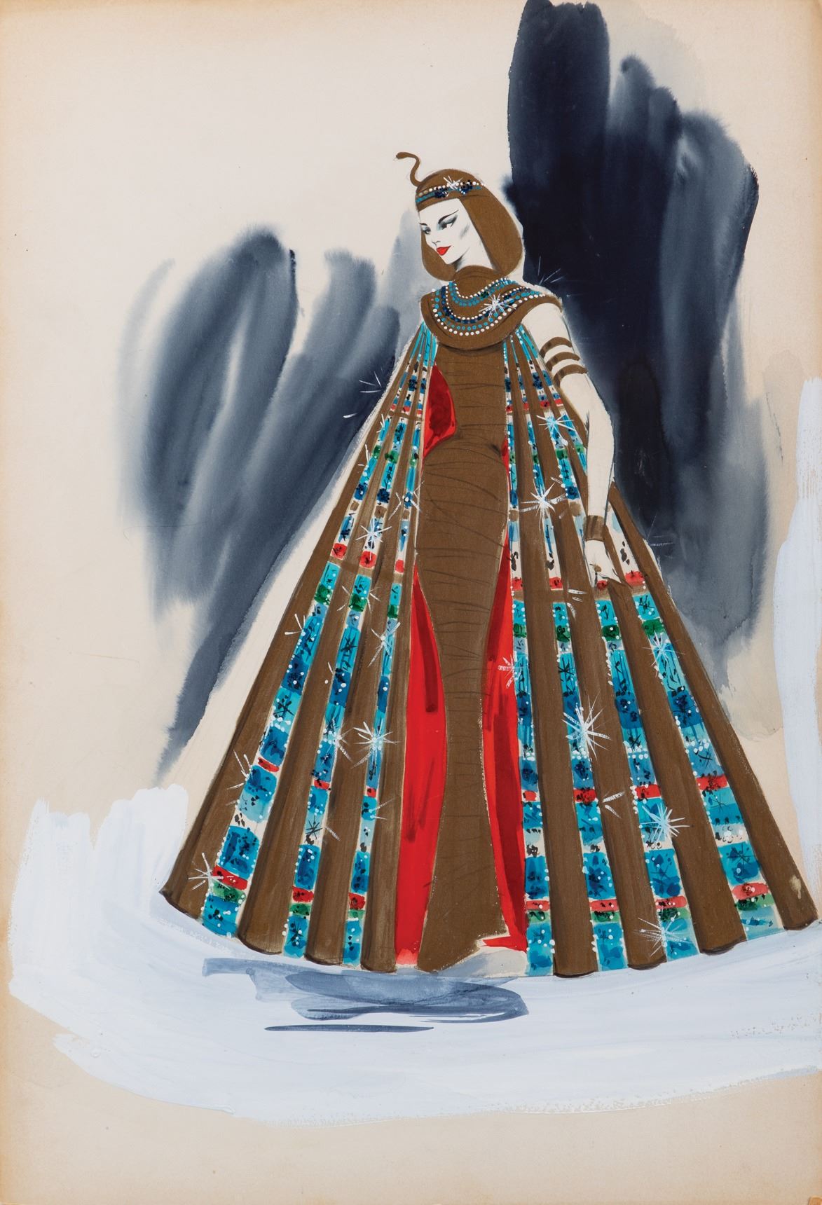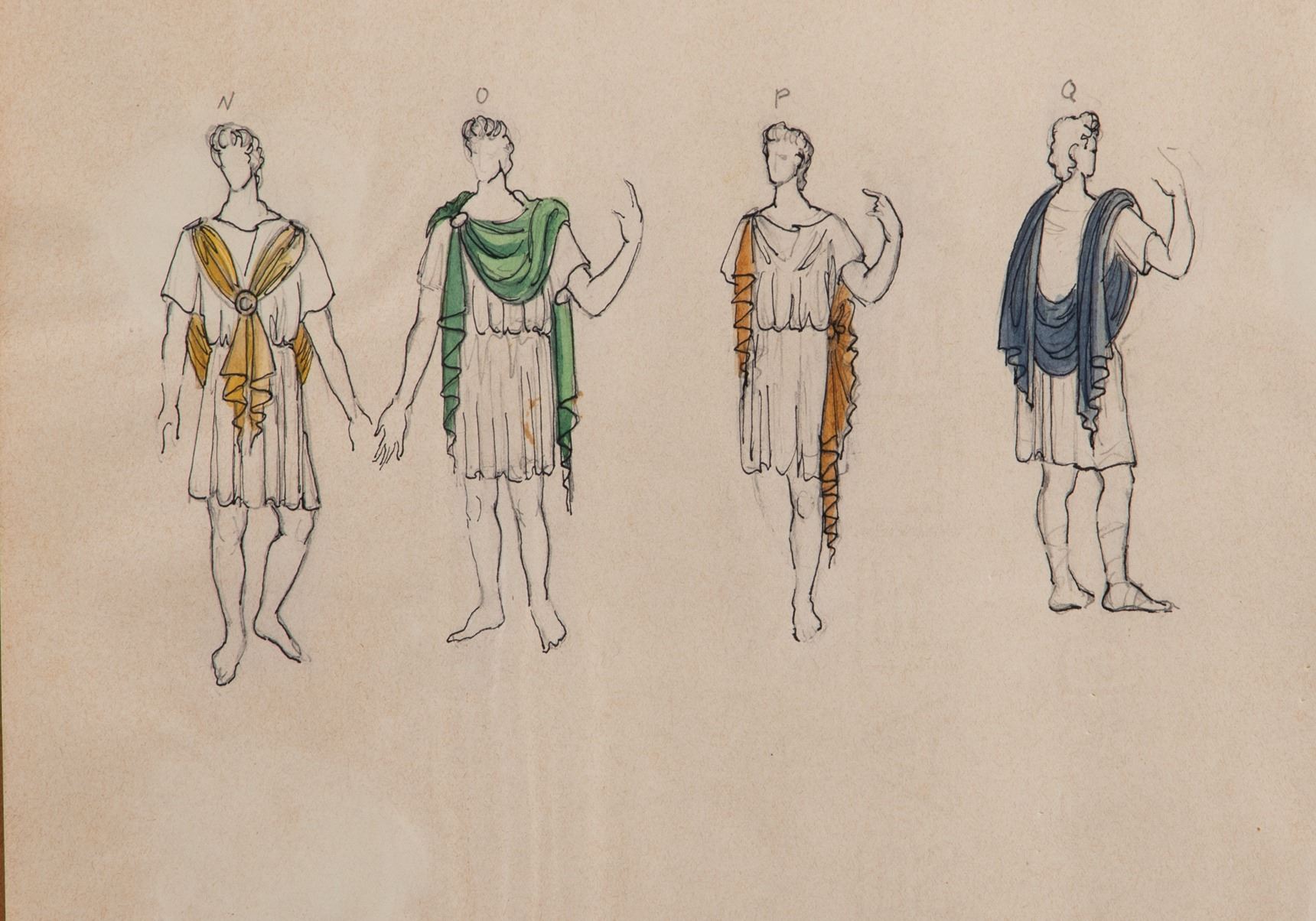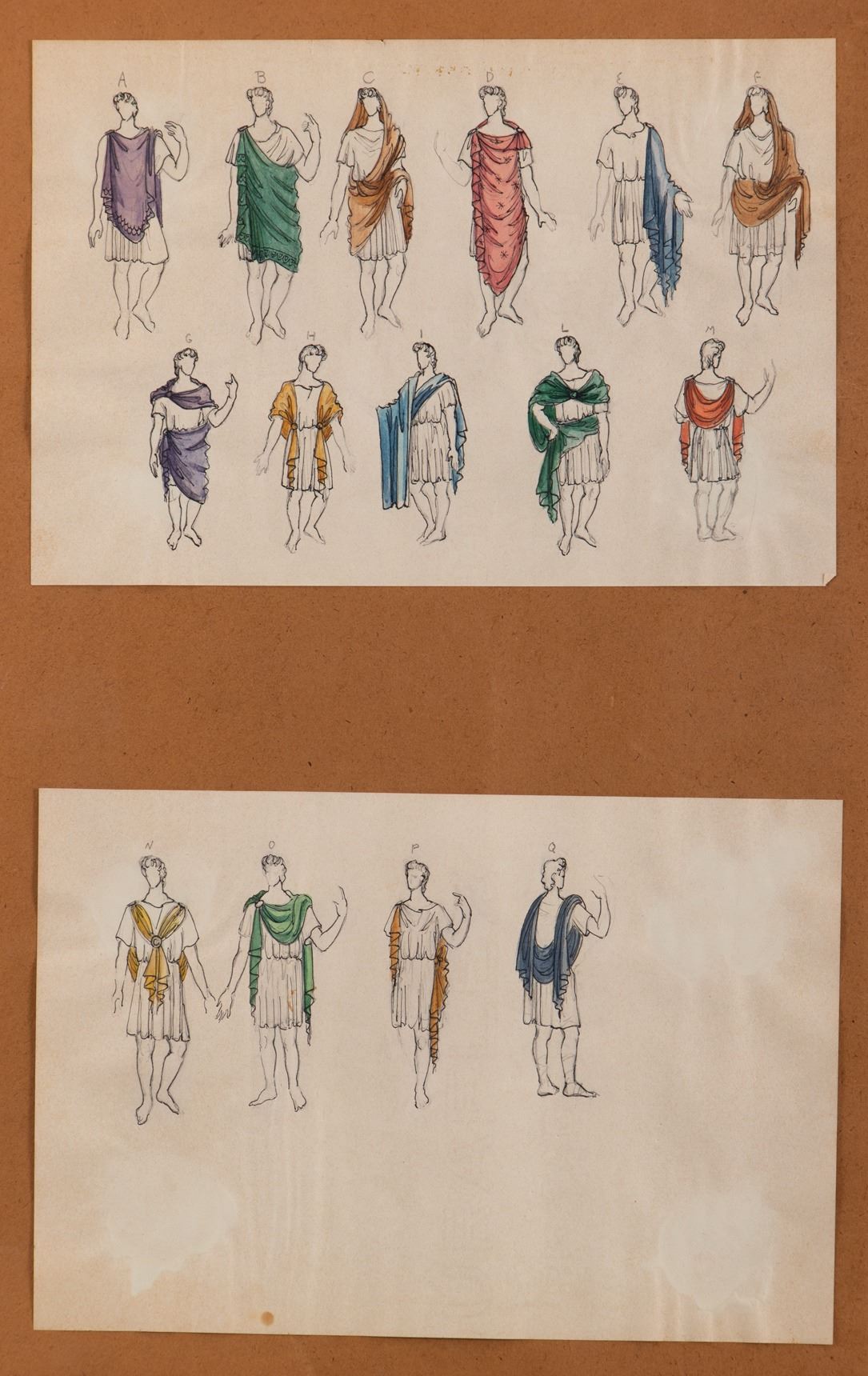 138. Antiquity (3) costume sketches including Cleopatra and (2) Roman toga study sketches. (ca. 1950s-1960s) Vintage (3) original sketches accomplished in pencil and gouache including (1) Cleopatra paint on 15 x 22 in. artists board, unsigned, unattributed and (2) toga sketches on 12 x 8 in. artists leafs tipped to 17 x 22.5 in. backing board. Both exhibiting minor production wear, age and even edge toning. In vintage very good to fine condition. $100 - $150