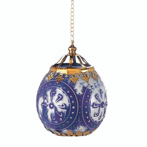 Antiquity Moroccan Hanging Candle Lamp **|**|** Like a treasure from long ago, this beautiful round hanging Moroccan candle lamp will fill your living space with exotic shimmer. Gold metal detailing and hanging chain are the perfect compliment to the worn blue and white finish.Description Details Item weight: 0.8 lb.Product Dimensions: 5 diameter x 6-1/2" high; 12-1/2" high with chain.Product Material: Glass and iron.UPC Code: 849179021238.Packaging: 1 EA"