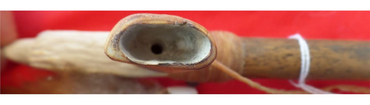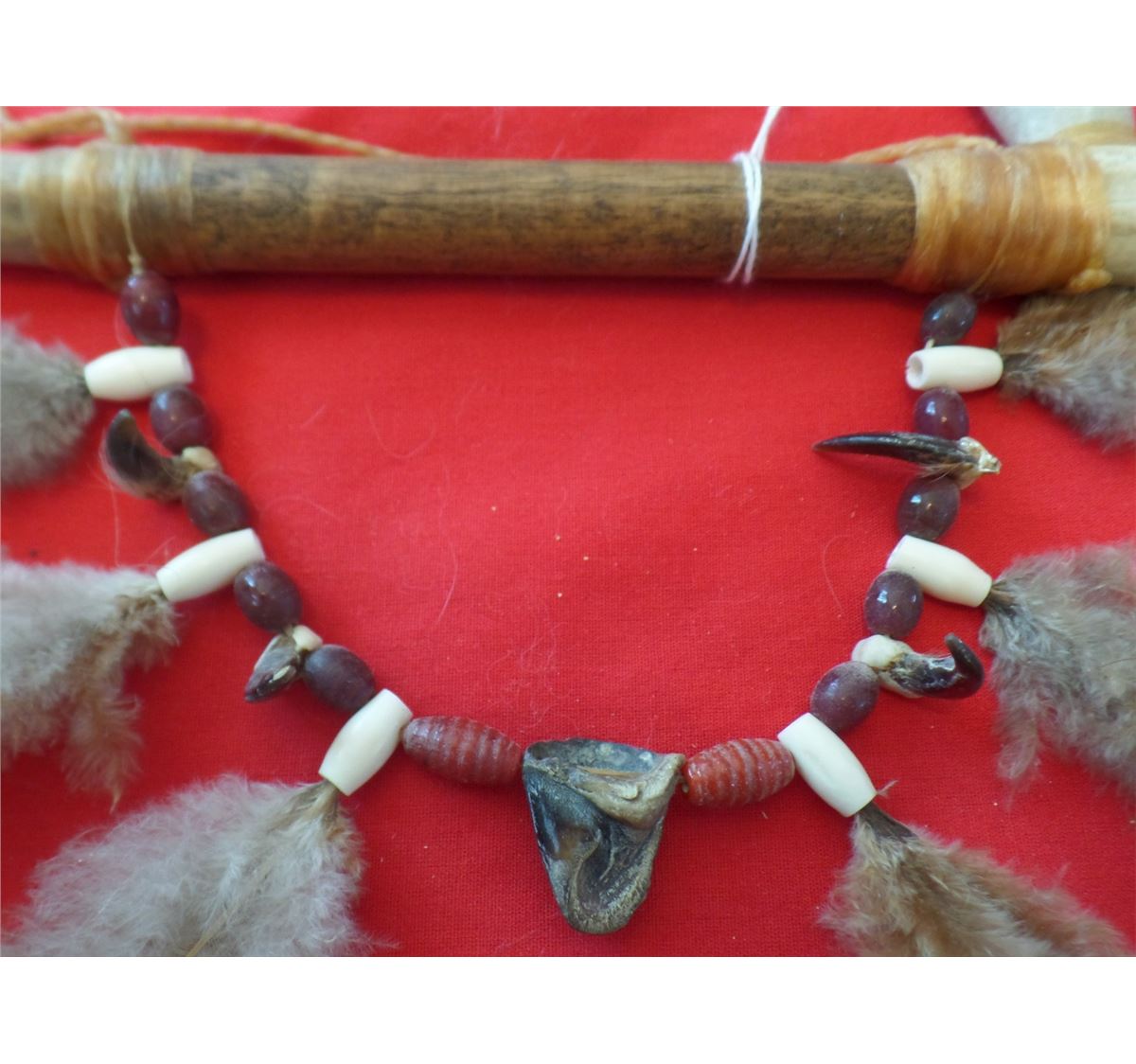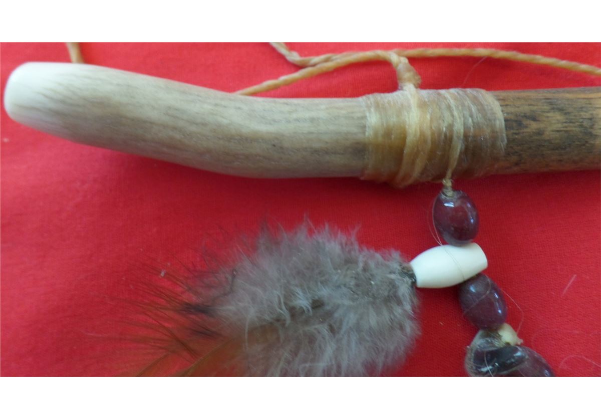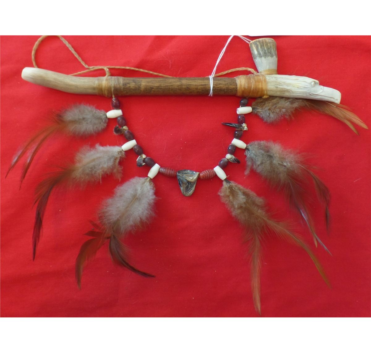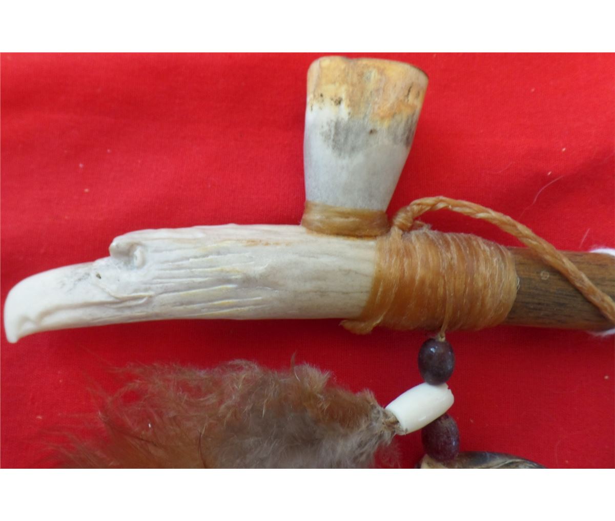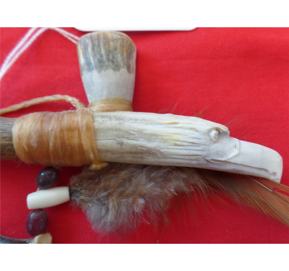 Antler Effigy Peace Pipe from the 1960s. Made of wood, antler, beads, feathers and deer toe nails. Measures 10" x 2". Sioux-South Dakota. Nice smoker or decorator peace pipe. Condition: Nice condition, never been smoked! Shipping: $18.