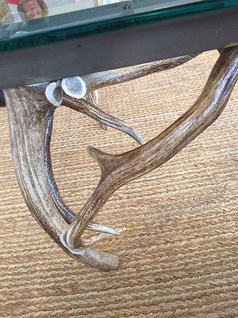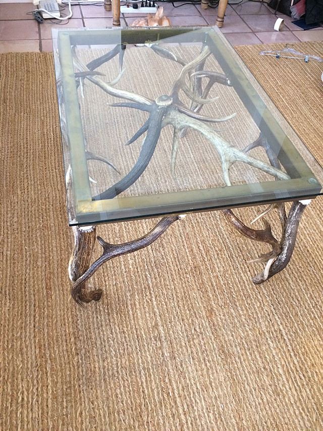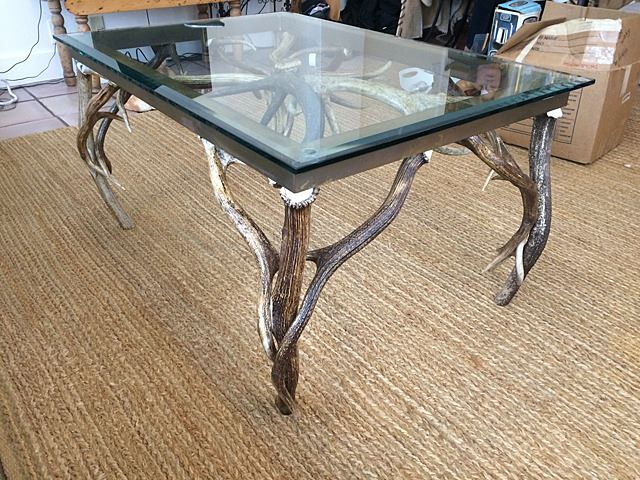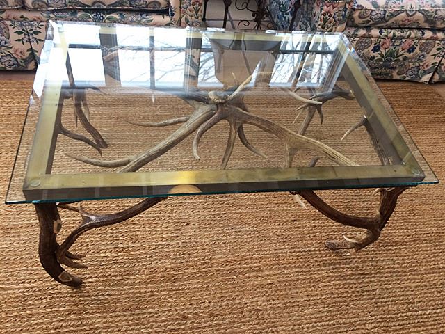 Very unique antler with bevelled glass top. Legs are made of antlers, great decorator item for cabin homes, Adirondack style. Bevelled glass and brass top.