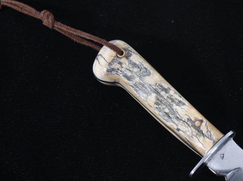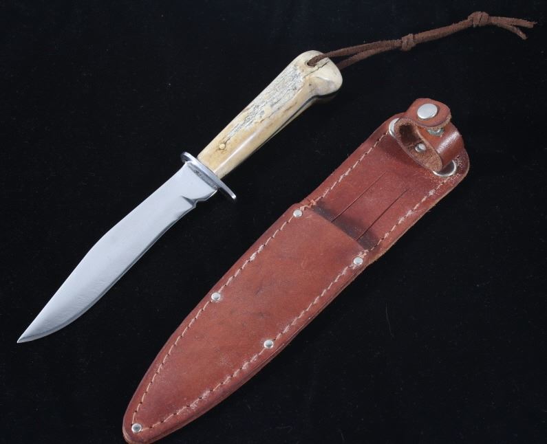 Included in this lot we have a antler handled buck knife with a leather sheath. The knife features a steel blade with the traditional clipped style blade. The piece shows a steel guard and an antler handled grip with a full tang. The grip shows two brass pins with the back pin having a hollowed center with a leather strap running through it. The sheath shows leather construction with both rivets and stitching. The sheath features leather grip clasp and belt loops. The knife shows good condition overall with some minor wear due to use. The knife measures 8 1/2" long overall with a just under 5" blade.