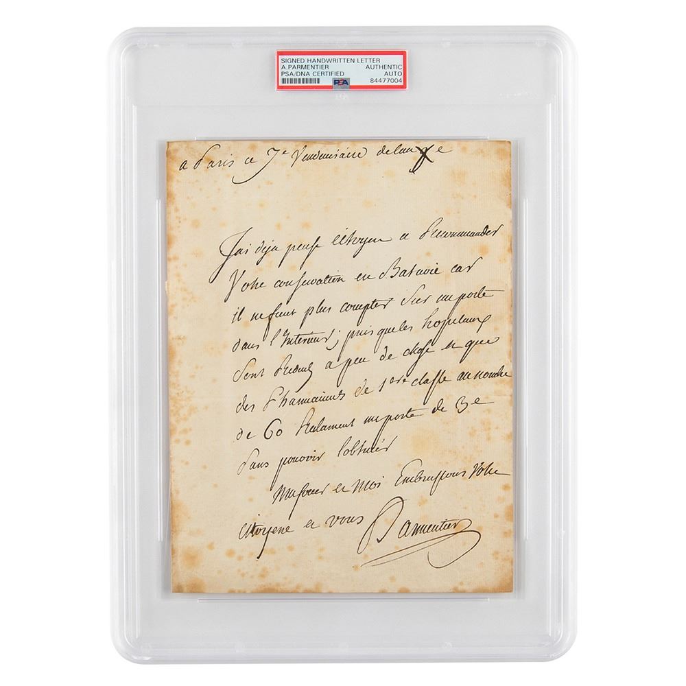 Important contributor to food and nutrition (1737-1813), who was a promoter of the potato as a food source and established the first mandatory smallpox vaccination. ALS in French, signed & ldquo;Parmentier,& rdquo; one page, 7 x 9.25, September 29, 1801. Untranslated handwritten letter to a pharmacist in Breda. In very good to fine condition, with moderately heavy overall foxing. Encapsulated in a PSA/DNA authentication holder.