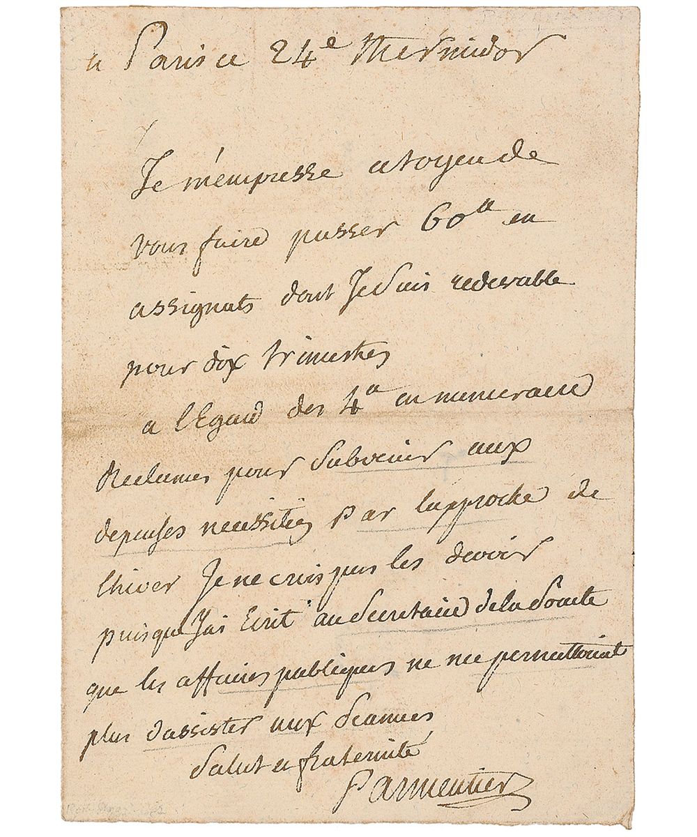 Important contributor to food and nutrition (1737–1813), who was a promoter of the potato as a food source and established the first mandatory smallpox vaccination. ALS in French, signed “Parmentier,” one page, 4.25 x 6, dated 24 thermidor [mid-August]. Untranslated letter written during the French Revolution, mentioning the paper money “assignats.” In fine condition, with small mounting remnant to reverse of second integral page and a touch of trivial soiling.
