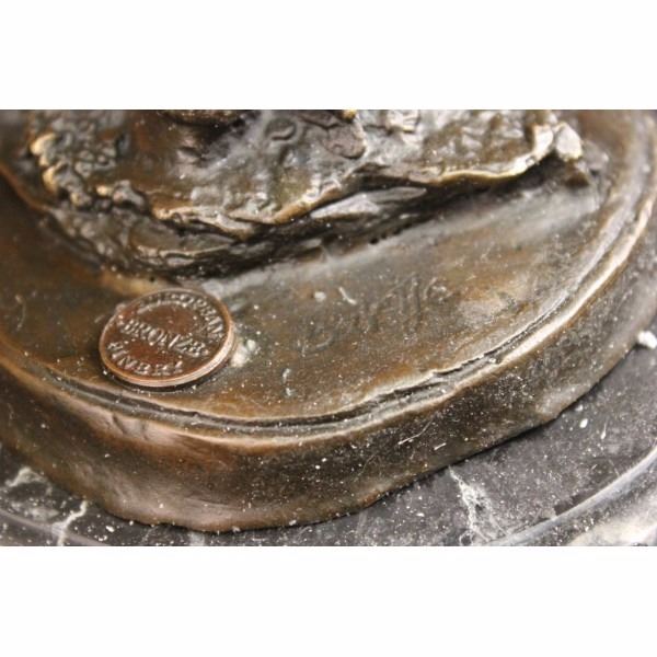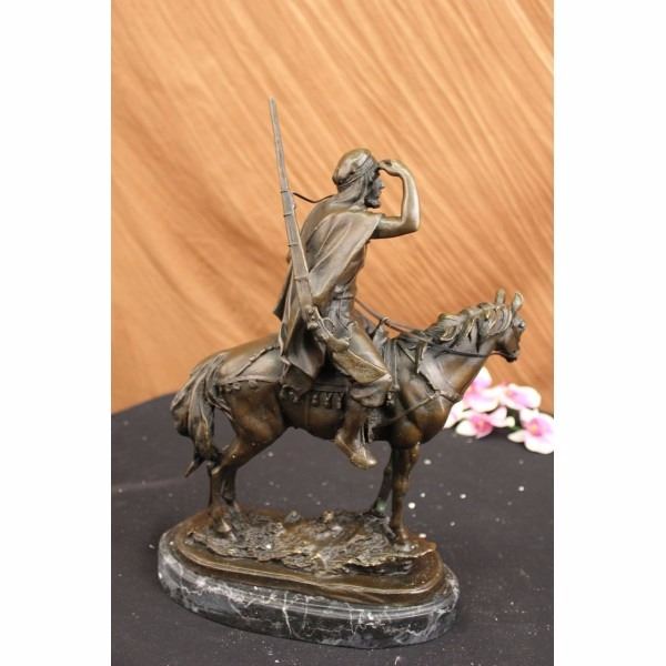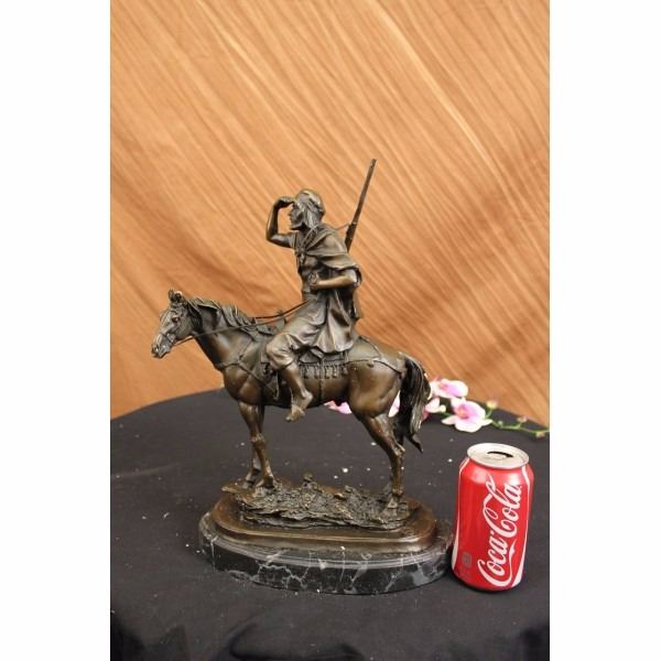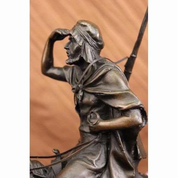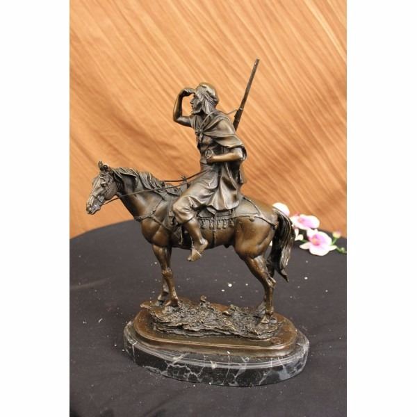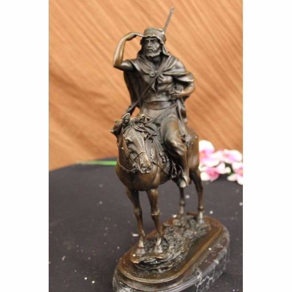 This sculpture features a man in traditional Arabian garb riding a horse through the desert searching for an oasis. He holds his hand up to shield the torturous sun as his eyes loose and find something in a mirage on the horizon. The handmade bronze sculpture was cast using the early method of lost-wax casting and stained with a brown patina finish for conservation. It is mounted upon a black marble base with the European Bronze Finery stamp of quality and the artist Barye's signature. Antoine-Louis Barye (September 24, 1796 June 25, 1875) was a French sculptor most famous for his work as an animalier, a sculptor of animals. Born in Paris, Barye began his career as a goldsmith, like many sculptors of the Romantic Period. After studying under sculptor Francois-Joseph Bosio and painter Baron Antoine-Jean Gros he was in 1818 admitted to the cole des Beaux Arts. But it was not until 1823, while working for Fauconnier, the goldsmith, that he discovered his true predilection from watching the animals in the Jardin des Plantes, making vigorous studies of them in pencil drawings comparable to those of Delacroix, then modelling them in sculpture on a large or small scale. Condition: This sculpture is in a very Good condition. Bronze Dimensions with Marble Base:Height 16" x Width 11" Marble Dimensions:Diameter 9" Height without base: 15" Weight :15 LBS Inventory : 14Y5677141