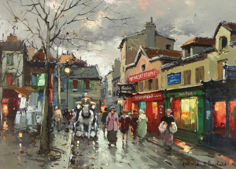 French [1910-1988] PARIS (PLACE DU TERTRE A MONTMARTRE) oil on canvas 13 x 18 in. (33 x 45.7 cm) signed "Antoine.Blanchard." recto; signed and titled "Paris" verso