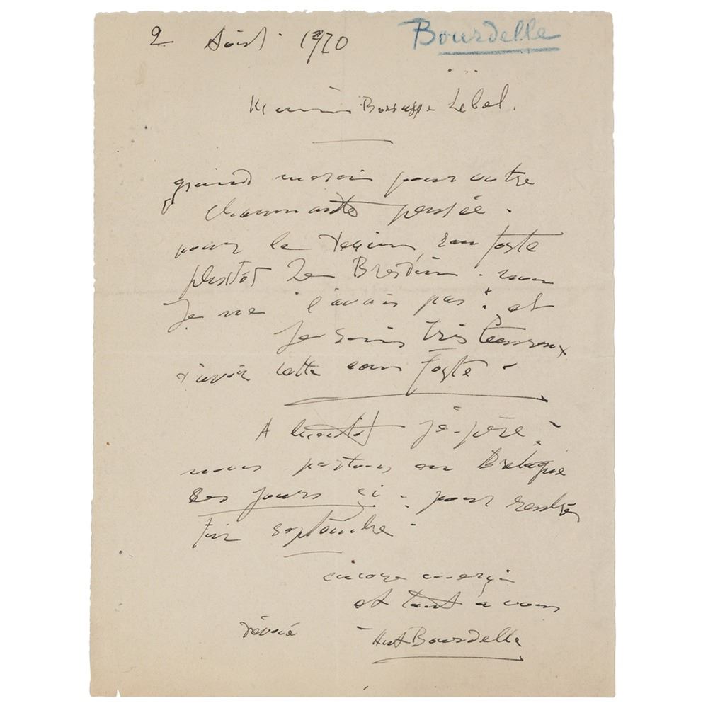 Untranslated ALS in French, signed “Ant. Bourdelle,†one page, 6 x 8, April 2, 1920. In fine condition.