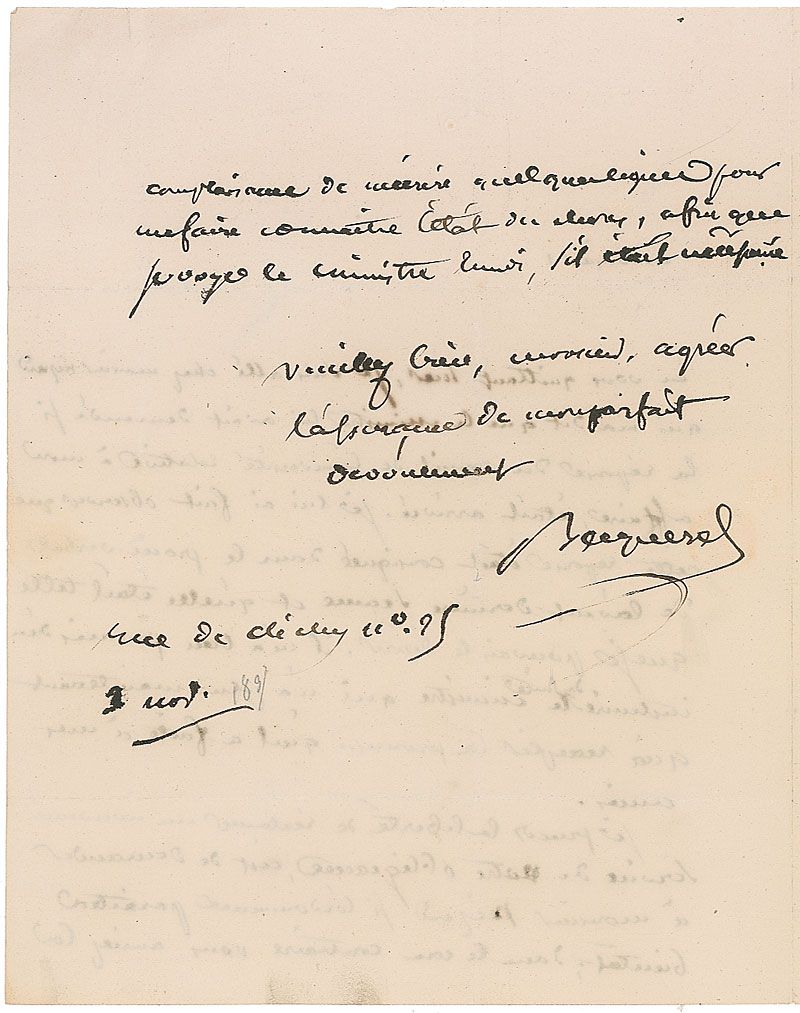 Scientist and pioneer in the study of electric and luminescent phenomena (1788–1878). ALS in French, signed “Becquerel,” one page both sides, 6.25 x 8, November 3, no year. Letter to educator Achille Comte. In part (translated): “I went to see Mr. Nigard who told me that the Minister had inquired as to whether the response of the University Council relative to my affair had arrived. I pointed out to him that this response was recorded in the minutes…and that it met my desires.” Reverse of the second integral page is also addressed in Becquerel’s hand. In fine condition, with unobtrusive intersecting folds.