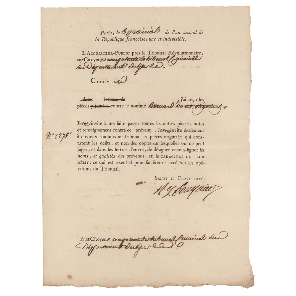 Scarce partly-printed DS, in French, signed “A. Q. Fouquier,†one page, 7.5 x 10, May 25, 1794. As public prosecutor, Fouquier acknowledges receipt of the proceedings of the negotiator Mr. Bernard Doat. In fine condition.