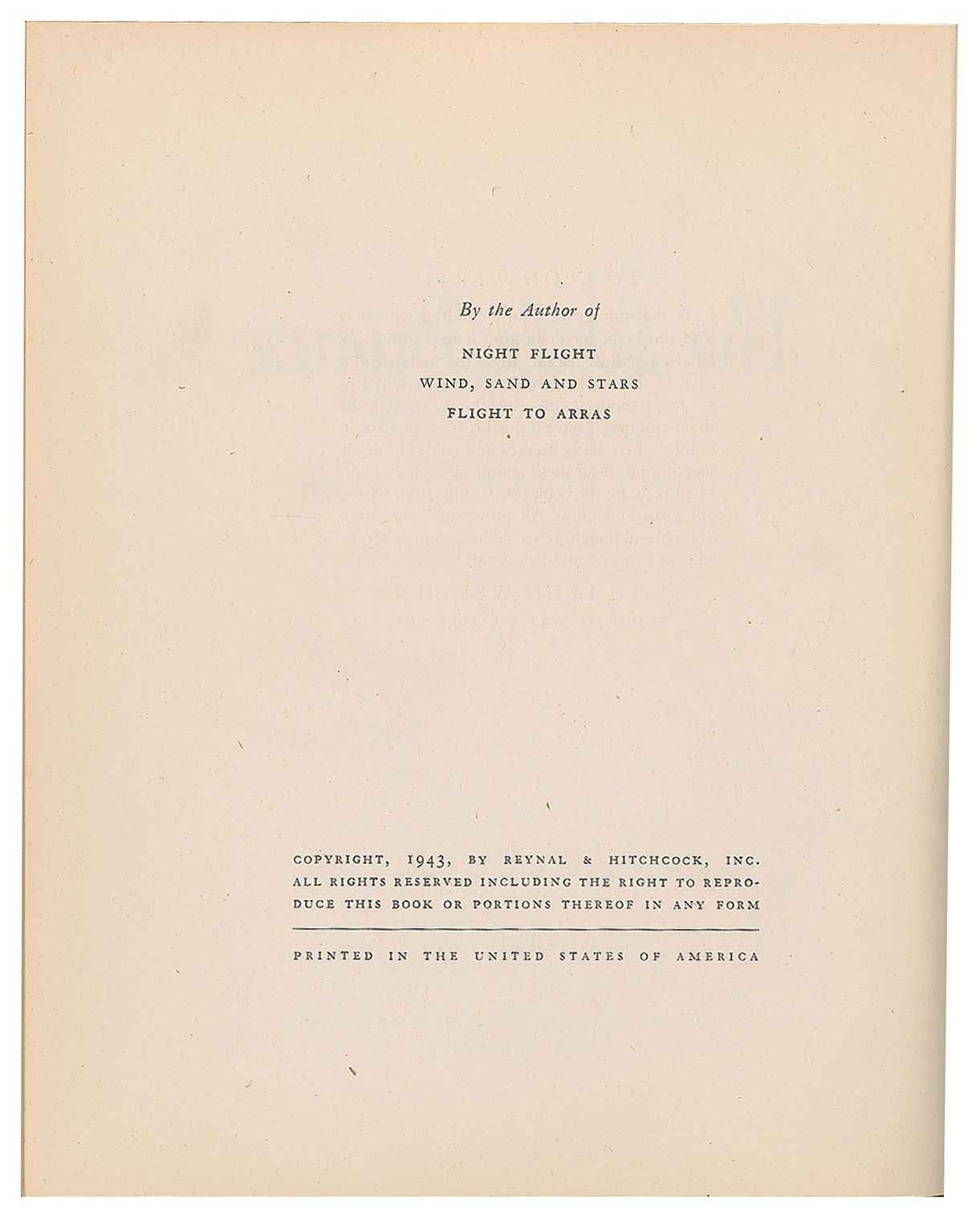 Sought-after unsigned true first edition book: The Little Prince by Antoine de Saint-Exupéry, translated from the French by Katherine Woods. First edition. NY: Reynal & Hitchcock, 1943. Hardcover in salmon boards, 7.25 x 9, 93 pages. Book condition: VG/None, with some light staining and rubbing to exterior.