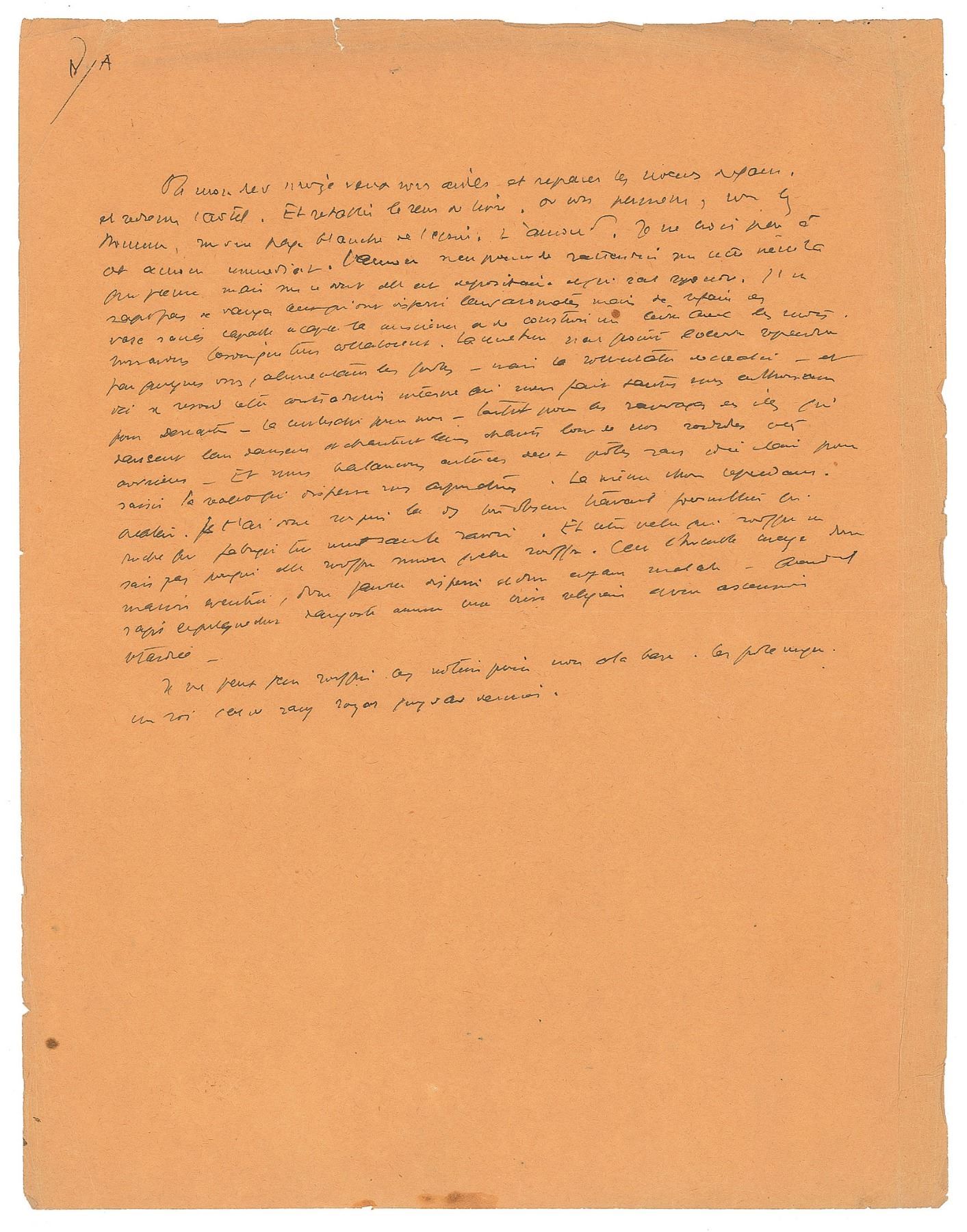 French poet, writer, and pioneering aviator (1900–1944) known for the classic book The Little Prince. While flying for the Free French Air Force in North Africa during World War II, he disappeared over the Mediterranean. Handwritten manuscript in French by Saint-Exupery, unsigned, one page, 8.25 x 10.5, no date but circa 1942. Possibly a page from his draft for 'Citadelle,' composed partly in the United States before his return to Europe and his last flight over the Mediterranean. In part (translated): "Oh, my God, I want to help you and repair the morals of the day and straighten the altar and restore the meaning of the book. You will be allowed, you men, on a blank page to write it. I no longer believe in this immediate love, love is not to be moved on this…but on that of which it is a depository and which alone radiates. It is not a question of putting away those who have scattered their spices but of redoing these sacred vessels capable of capturing consciousness and of building a book with the words we need everyone to collaborate." In very good to fine condition, with light edge creasing and a few short edge tears.
