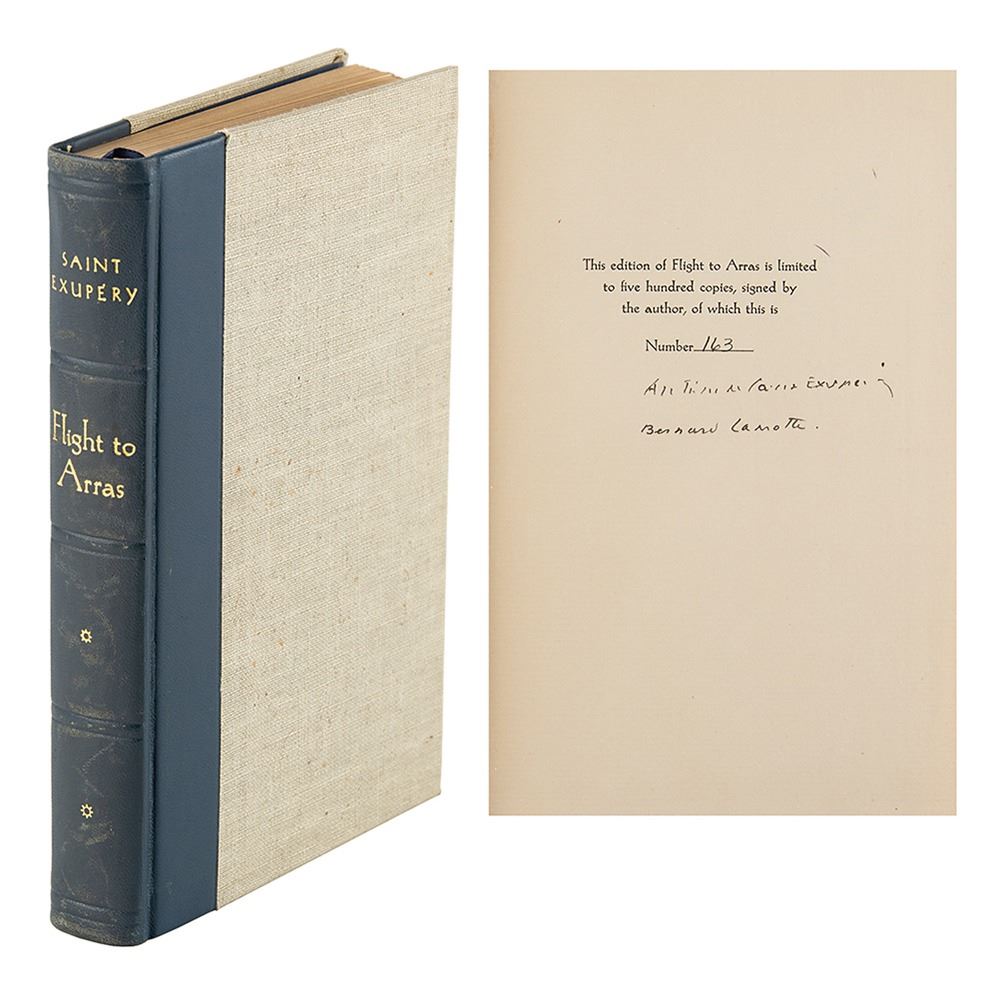 Signed book: Flight to Arras. First edition. NY: Reynal & Hitchcock, 1942. Hardcover with slipcase, 6 x 8.5, 255 pages. Signed on the colophon in fountain pen by the author, Antoine de Saint-Exupery, and illustrator, Bernard Lamotte. Autographic condition: fine. Book condition: VG+/None in a G slipcase, with light scuffing to spine and sunning, dampstaining, and edge splits to the case. Written in 1942, Flight to Arras recounts Saint-Exupery's role in the Armée de l'Air (French Air Force) as pilot of a reconnaissance plane during the Battle of France in 1940.