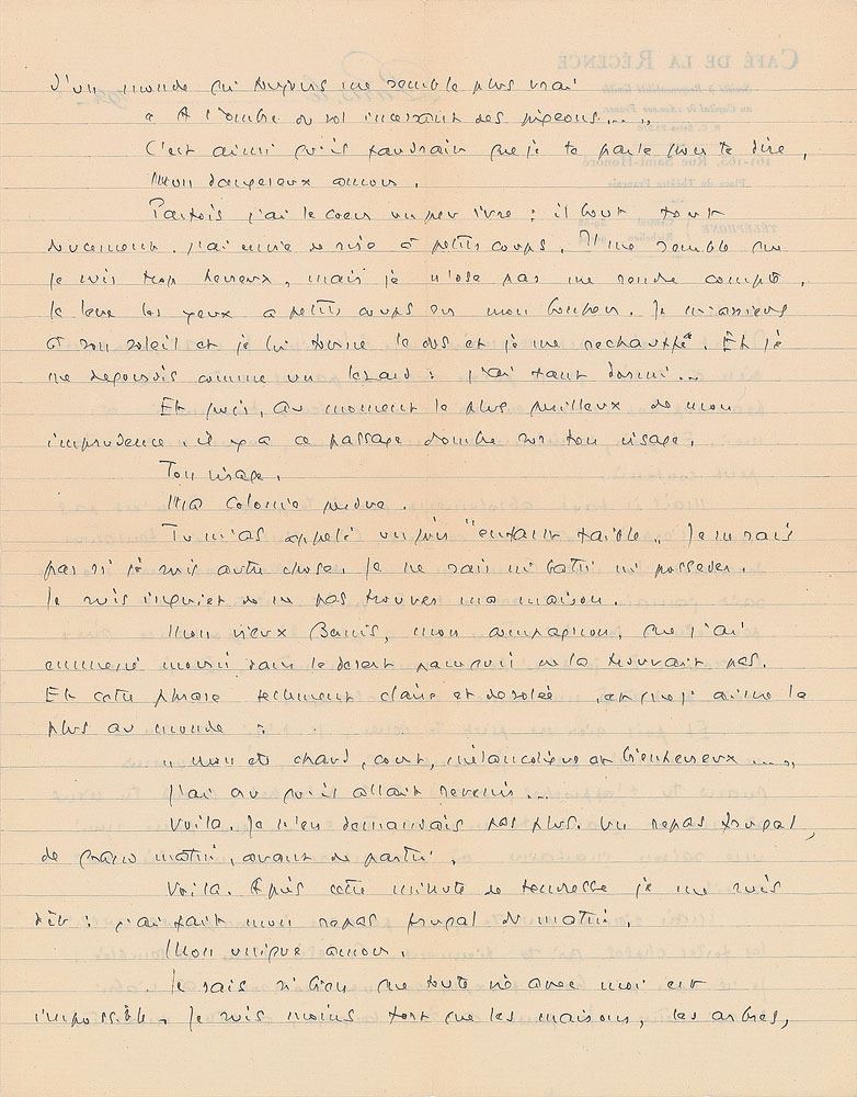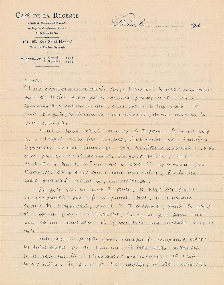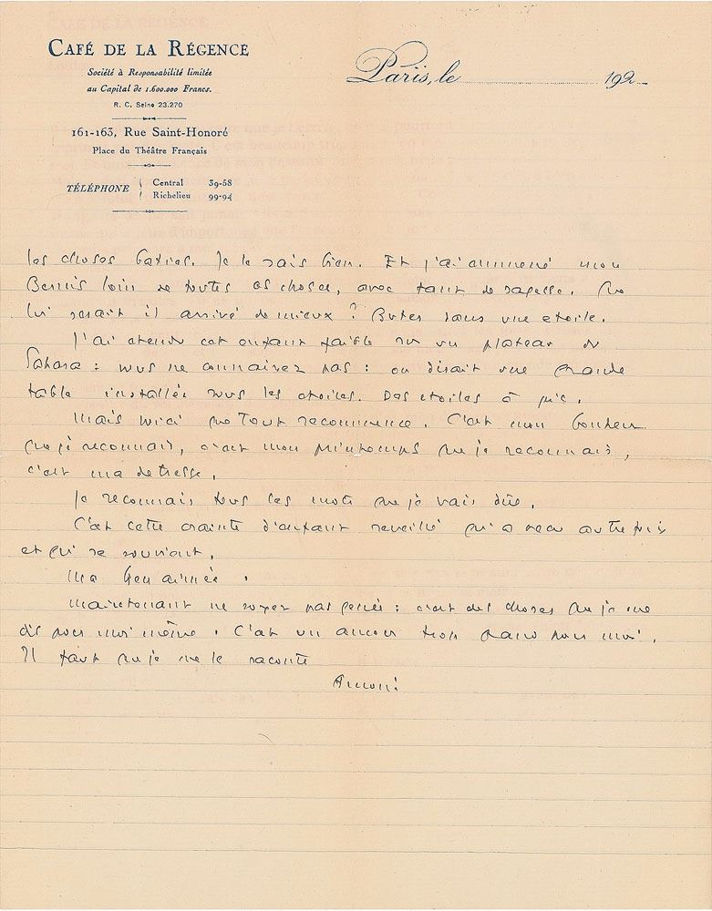 ALS in French, signed “Antoine,” three pages on two sheets, 8.5 x 10.75, Cafe de la Regence letterhead, no date but circa 1929. A love letter to his former fiancee, Louise Leveque de Vilmorin. In part (translated): "It is absolutely necessary that I write to you. But I have nothing to say to you that I can express in words. It is far too intimate in me, it is too much mixed with me. And then, the violence of my distress, no word can contain it. But I must speak to you. It is not in the hope of being well understood. It is rather a desperate attempt. The words. As we drop pigeons travelers, we never know if they arrive. And then you see, it may be the gift itself that is more important than home. And I gave you everything myself. And I repeat to myself, this slavery. And nothing can stop you. I told you that I did not understand…I understand everything, I understand when you approach, when you stand out, when you come to me and when you exile me. You are a little for me an uncertain season where I ventured my illness under the sun. But nothing can surprise you because I also understand the strong things that hold you. This desire to be gathered. I do not know how to explain to you: a harvest sheltered from oneself. I thought your language, this invention of a world that always seems more true to me. In the shadow of the constant flight of pigeons." In fine condition, with general light handling wear and splitting to a horizontal fold. Accompanied by an export certificate from the French Ministry of Culture.