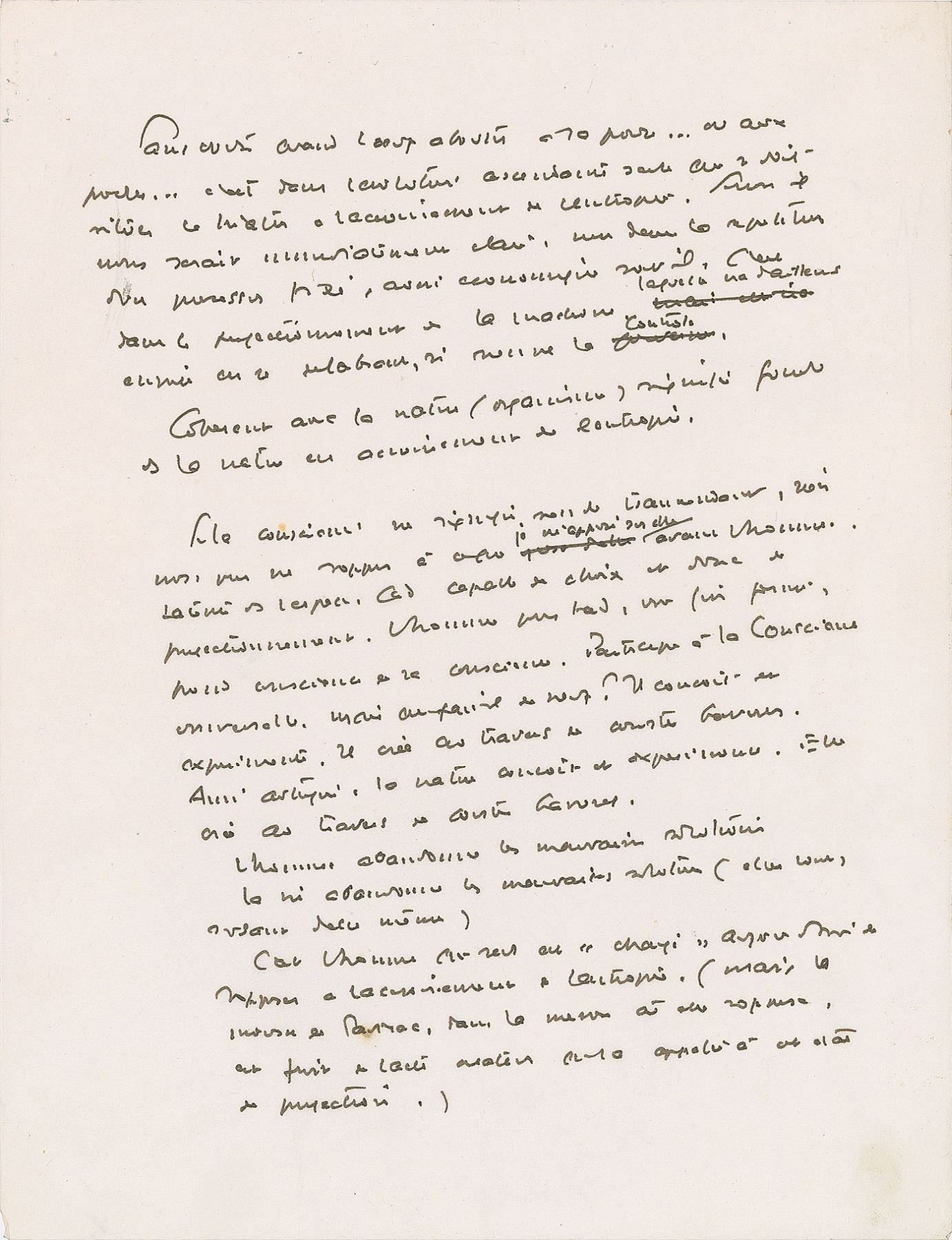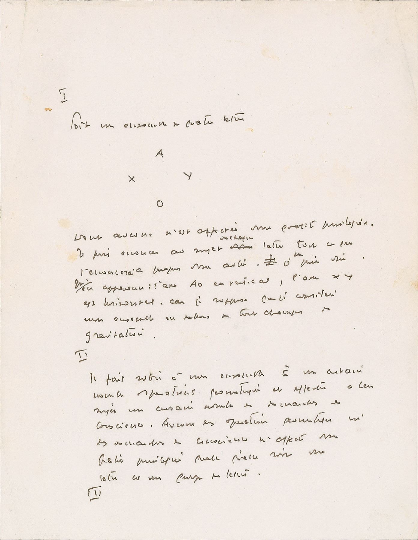 Magnificent handwritten manuscript in French, unsigned, five pages, 8.5 x 11, no date. An interesting collection of handwritten mathematical expressions and notes by Saint-Exupery. In fine condition, with scattered light creasing and staple holes to the upper left corner. Saint-Exupery loved mathematical enigmas and riddles, and possessed superior skills in the subject, making this an especially desirable piece.