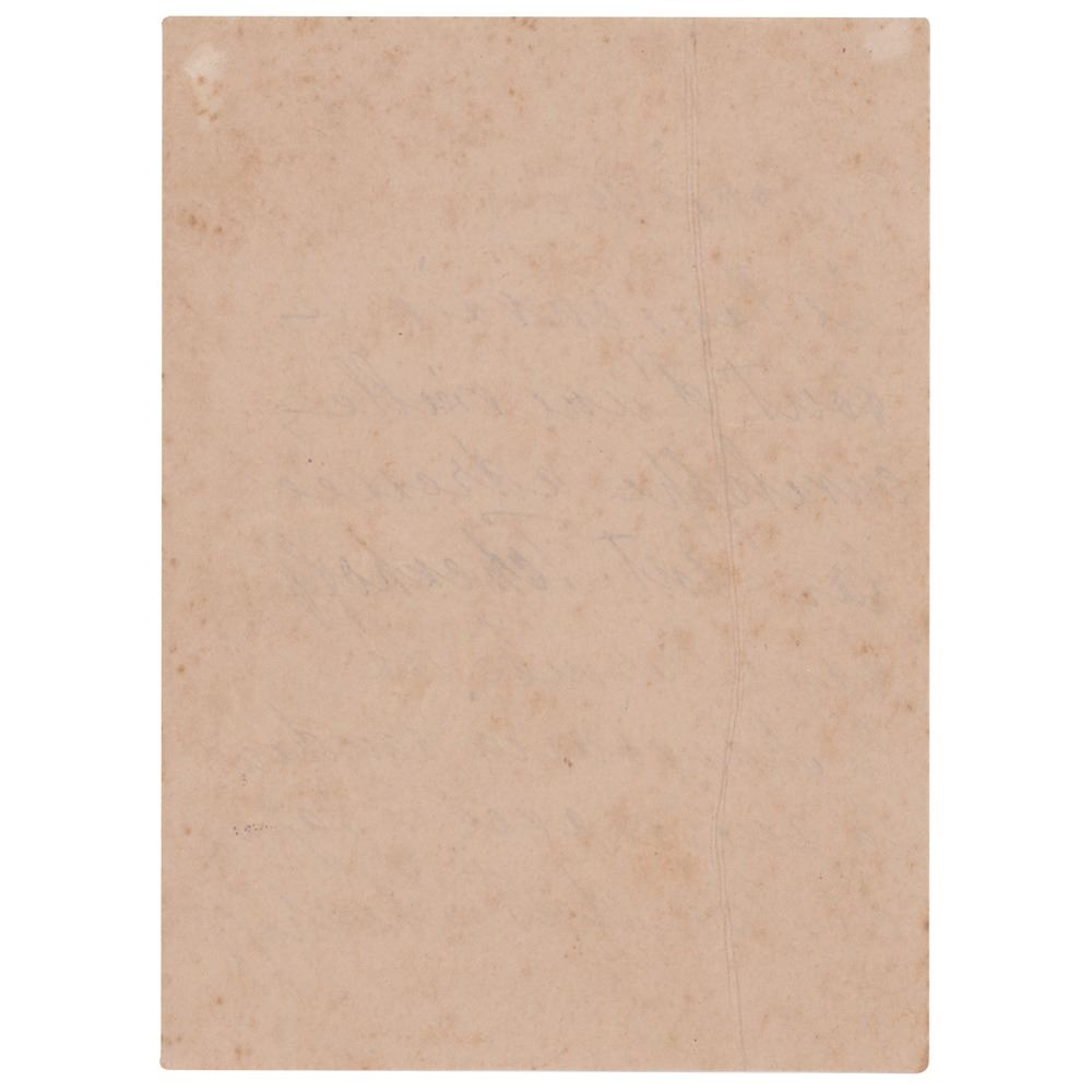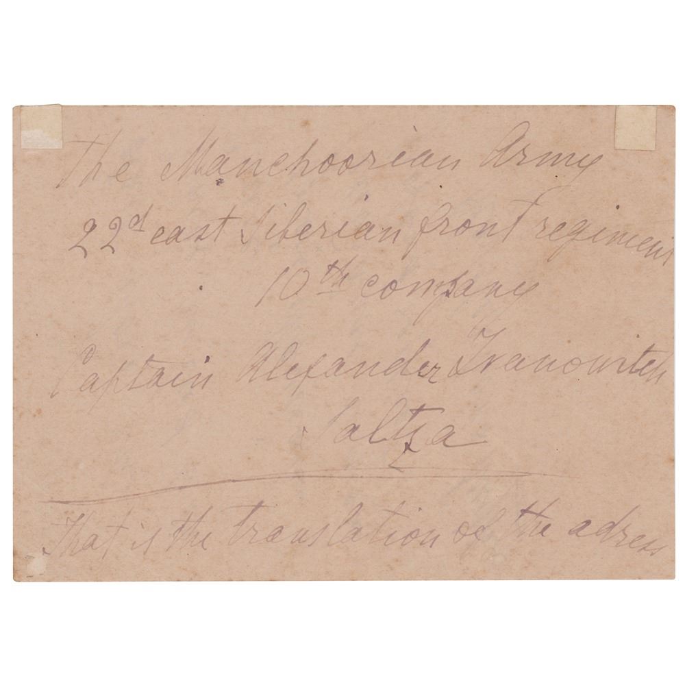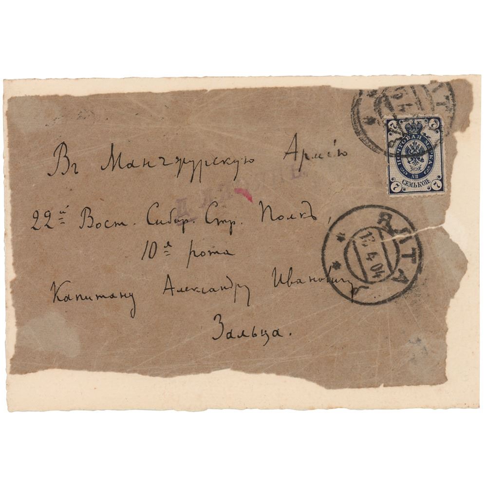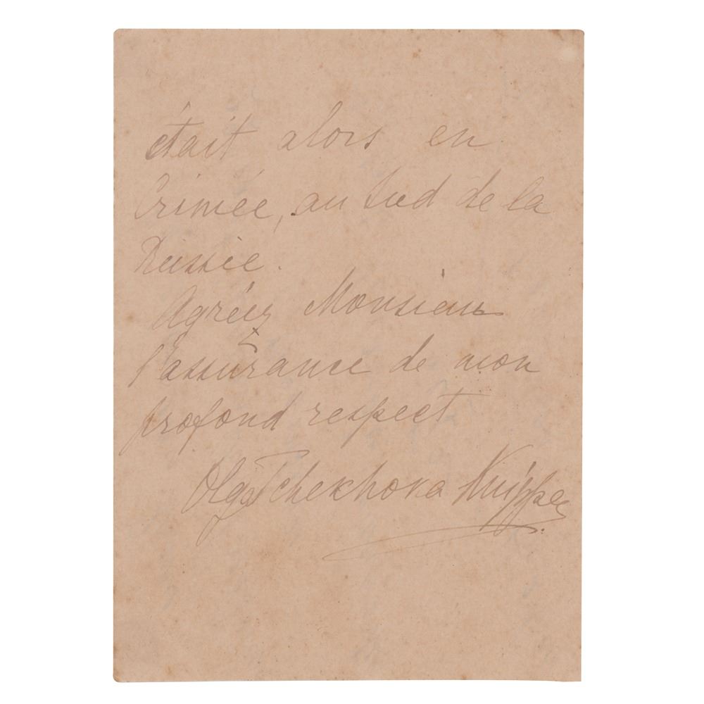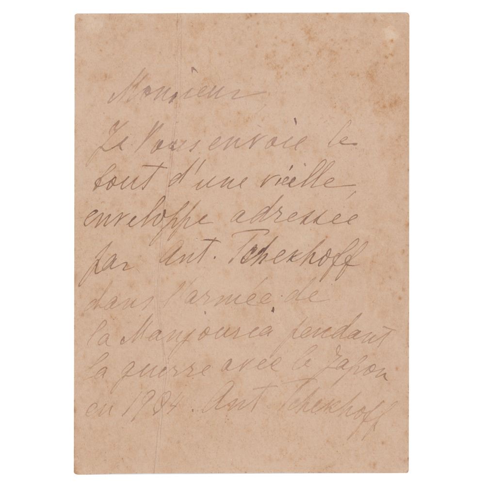 Exceedingly rare address panel from the front of a mailing envelope, 5.25 x 3.25, addressed in Anton Chekhov's hand to Captain Alexander Ivanovitch of the 22nd East Siberian Front Regiment, 10th Company, with an affixed postage stamp and two postal cancellations, one dated April 13, 1904. Affixed to a slightly larger card and in very good condition, with a few tears and rough edges. Accompanied by a letter in French by his wife, signed "Olga Tchekhova Knipper," sending her correspondent the front panel from her husband's envelope, explaining that it was sent by Chekhov from the Crimea, in the south of Russia, while he was serving in the Manchurian Army in the war against Japan in 1904; on the reverse of the second page, she pens a translation of the address written by her husband.