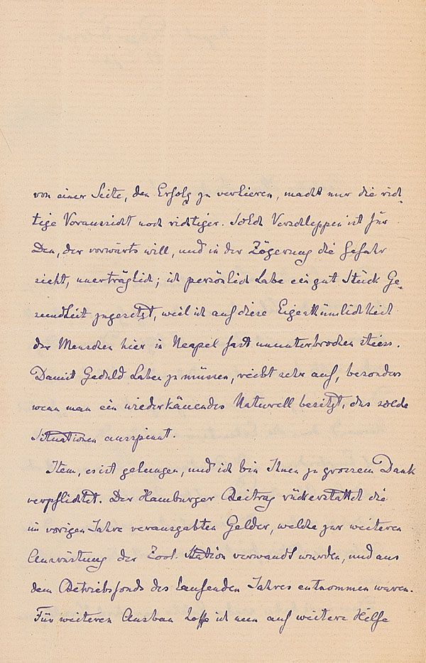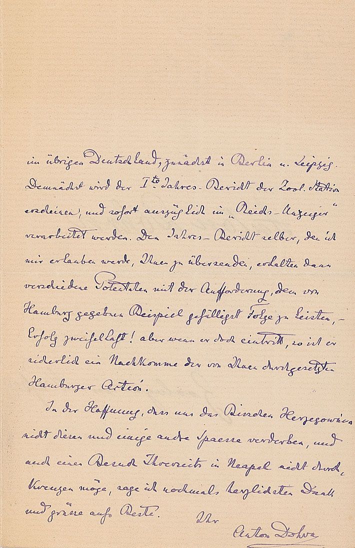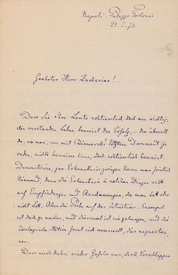 German Darwinist and zoologist (1840–1909) who, in 1872, founded the Stazione Zoologica in Naples. ALS in German, three pages on two adjoining sheets, 4.5 x 7, Naples, January 1, 1876. Letter to Otto Zacharias. In part (translated): “One cannot force a pe