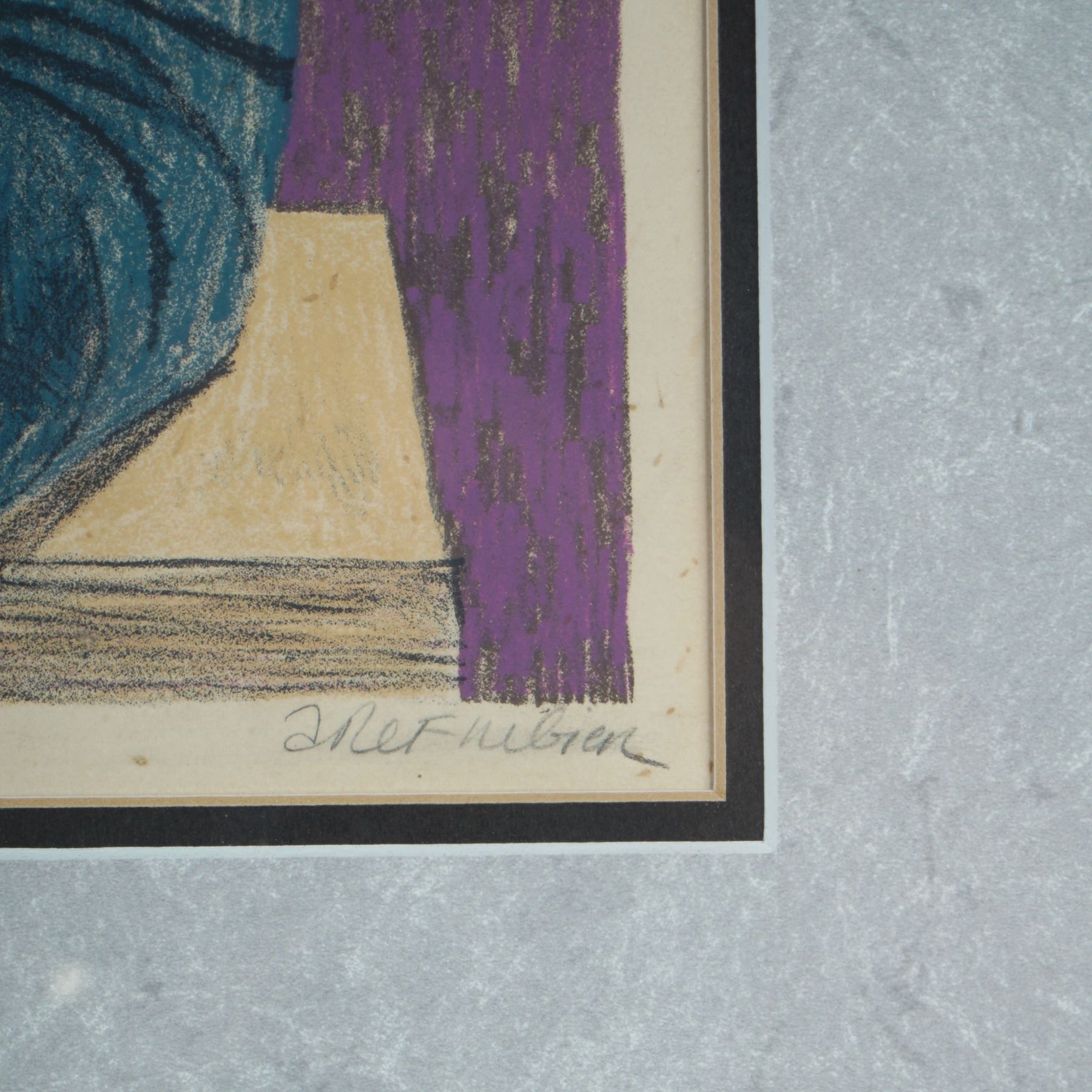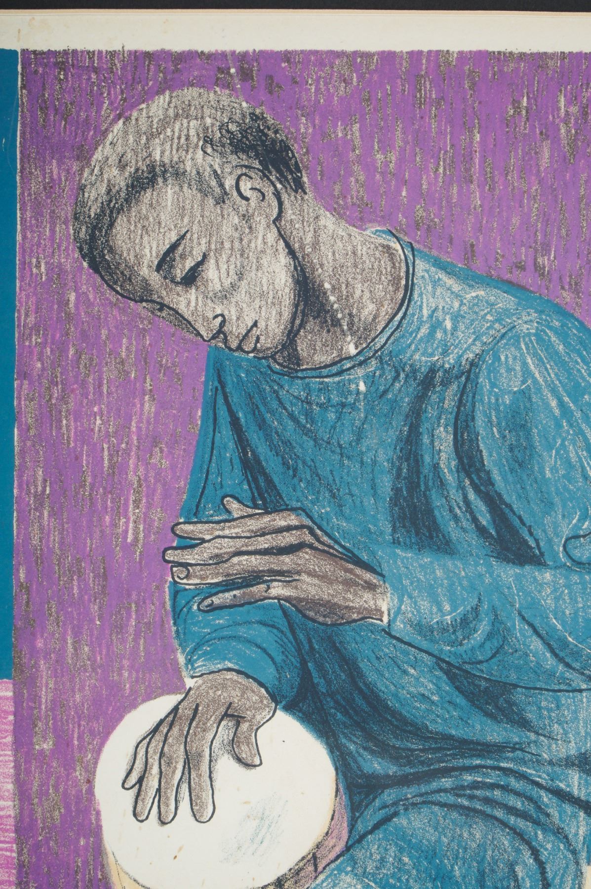Color lithograph titled Three Musicians by Anton Refregier, depicting a trio of musicians-a guitarist, flutist, and drummer-each rendered in bold outlines and expressive color blocking. The composition is divided into three panels, emphasizing musical engagement and harmony. Anton Refregier was a prominent Russian-American Social Realist painter and muralist known for his depictions of American labor and daily life. He immigrated to the United States in the 1920s and became a major figure in public art, most notably through his History of San Francisco mural cycle at the Rincon Center, commissioned under the New Deal. Refregier's work is recognized for its strong linear style, humanist themes, and political awareness. Signed by the artist in pencil at lower right and numbered 247/275 at lower left. Professionally matted and framed.