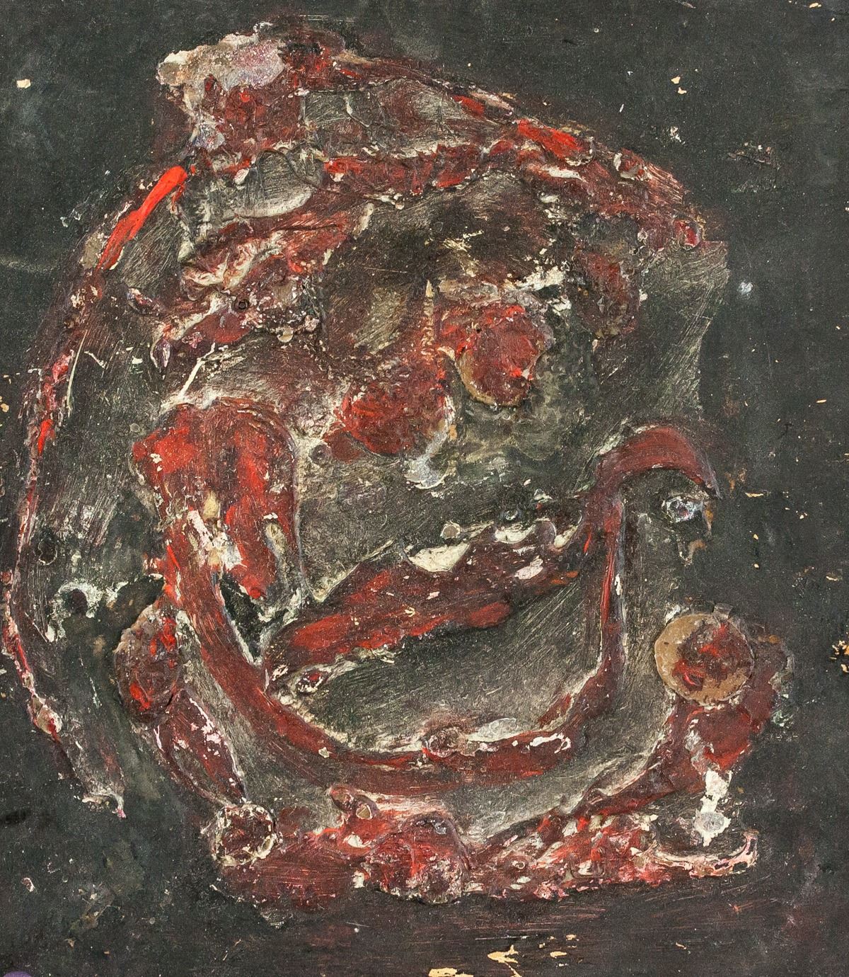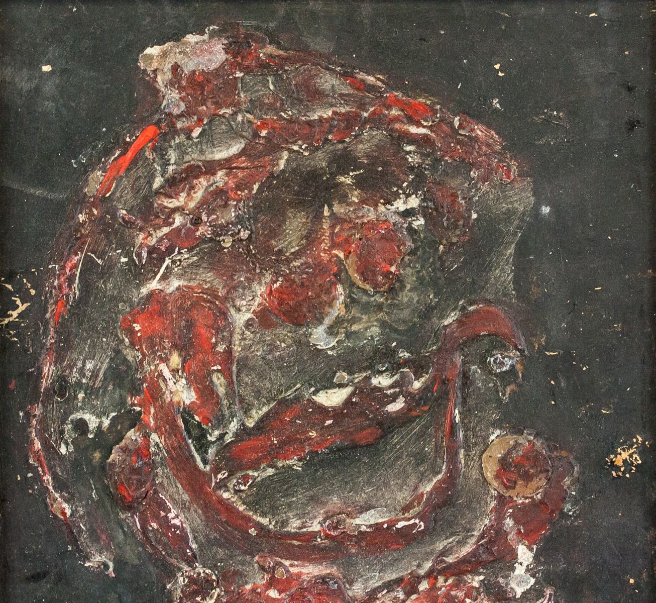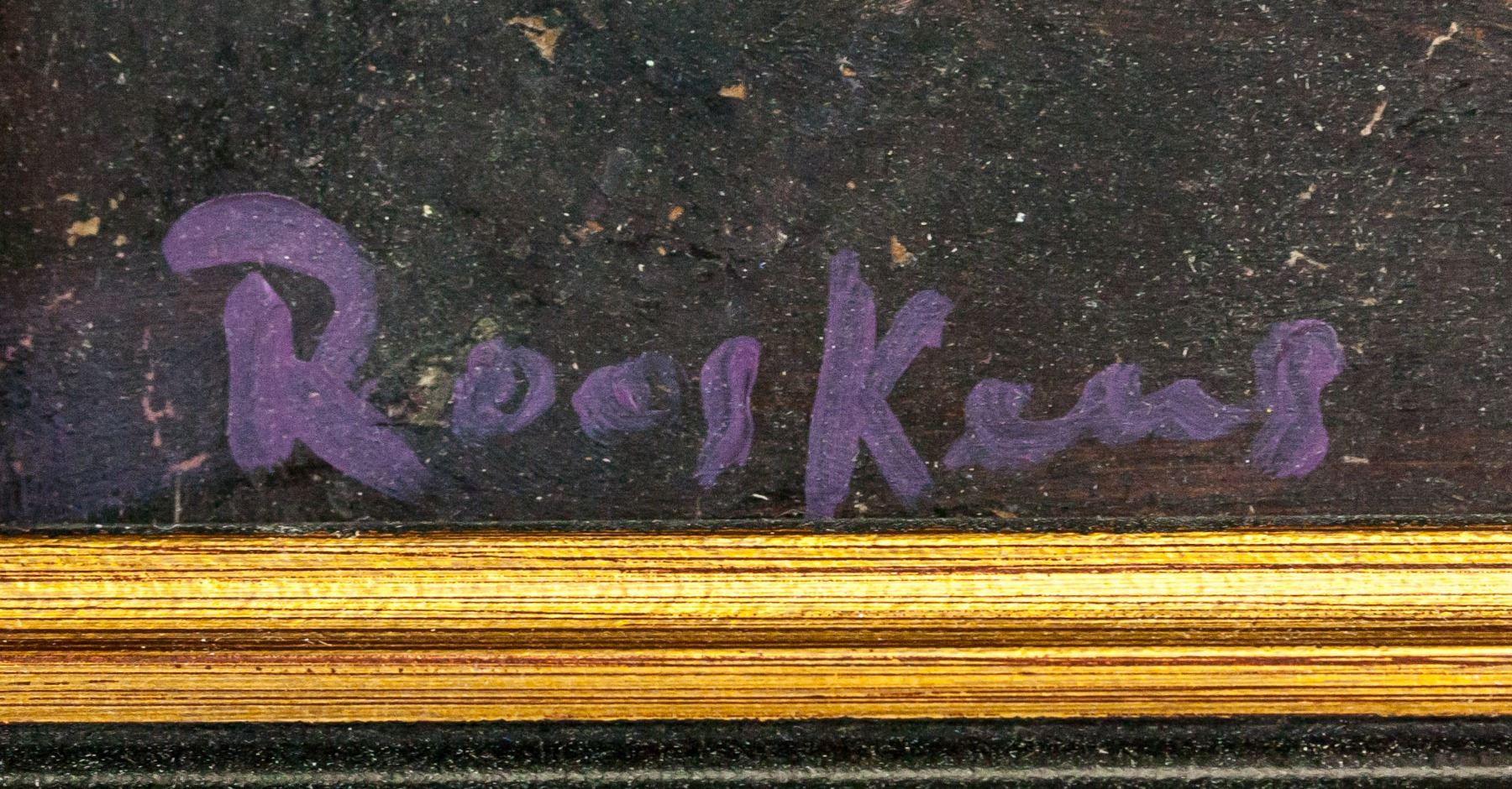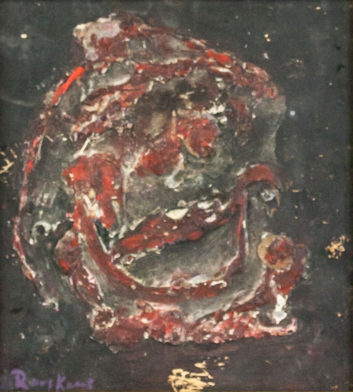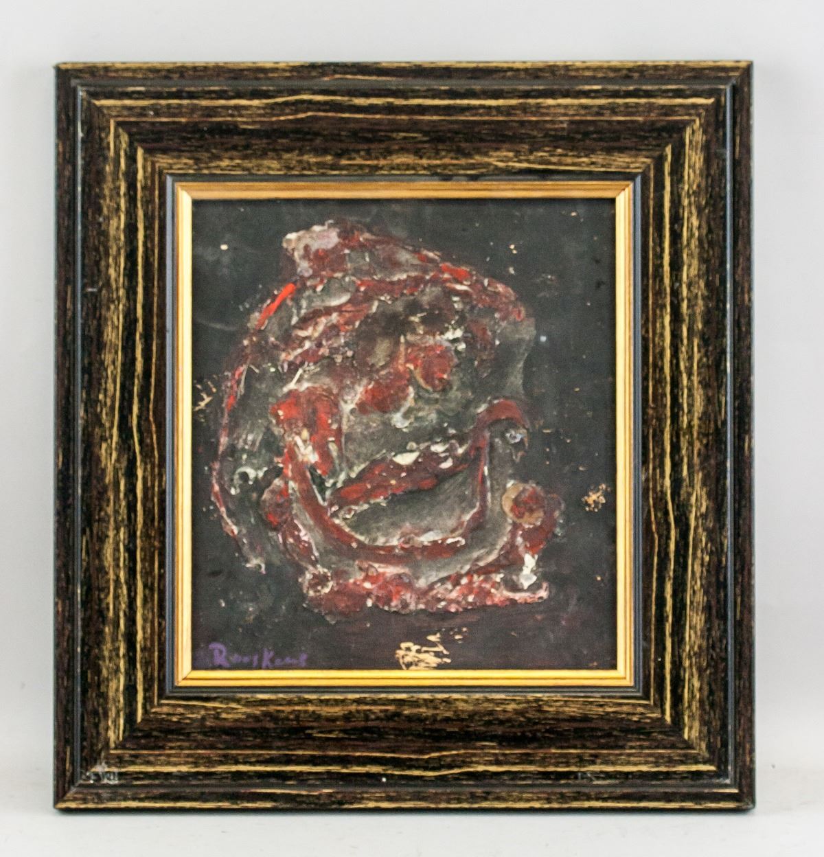 Oil on canvas, stretched and framed. Featuring an abstract expressionist composition. Signed Rooskens on the lower left corner. Attributed to Anton Rooskens (1906-1976, Dutch). 26.5 x 24.5 cm (10.4 x 9.6 inches). Frame size: 42.5 x 42 cm (16.7 x 16.5 inches). Southern Ontario estate