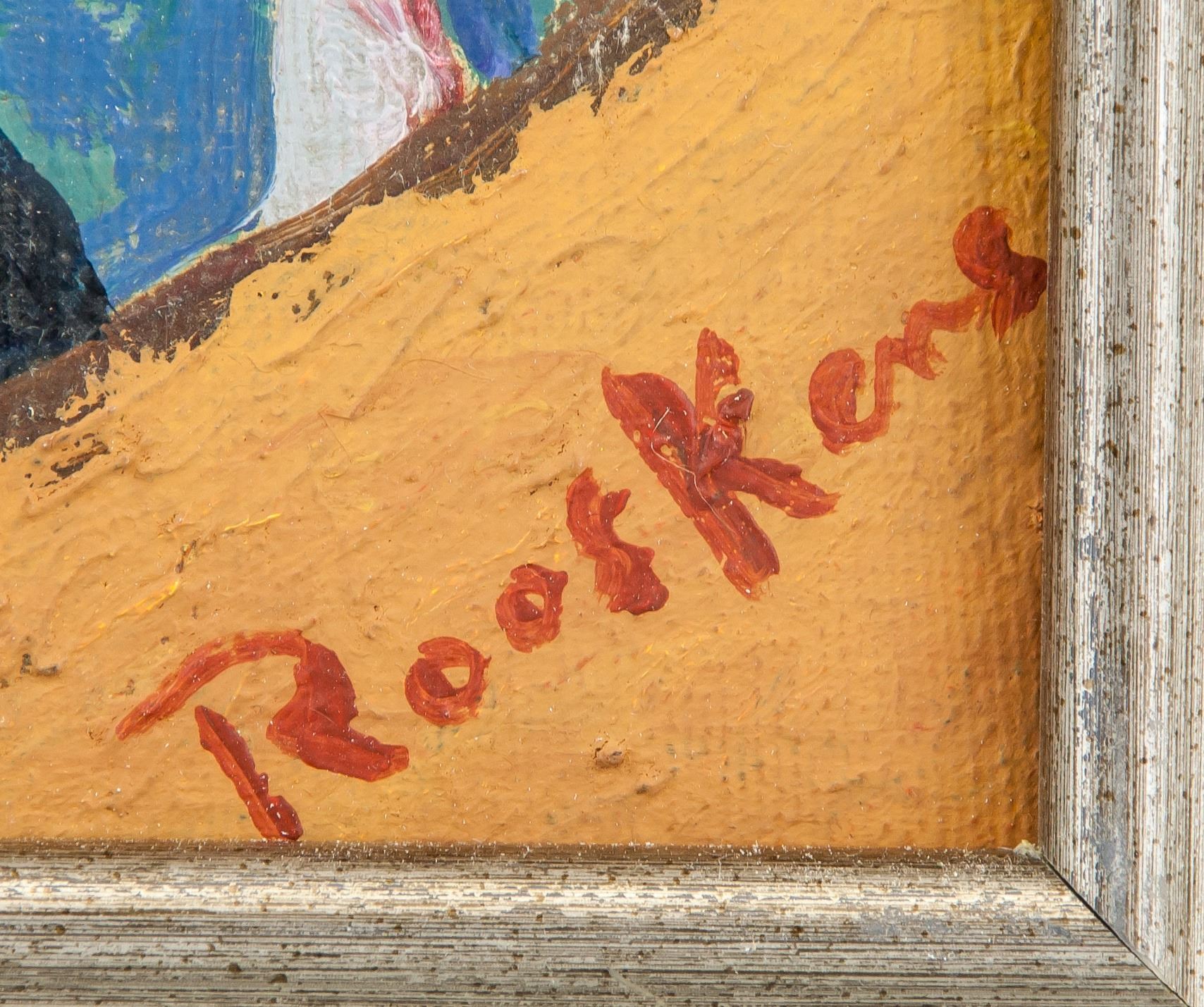 Oil on canvas. Featuring abstract composition, untitled. Signed RoosKens on the lower right corner. Attributed to Anton Rooskens (1906-1976, Dutch). 7.7 x 8.1 in. (19.5 x 20.5 cm). Provenance: This lot carries limited provenance from a Southern Ontario estate
