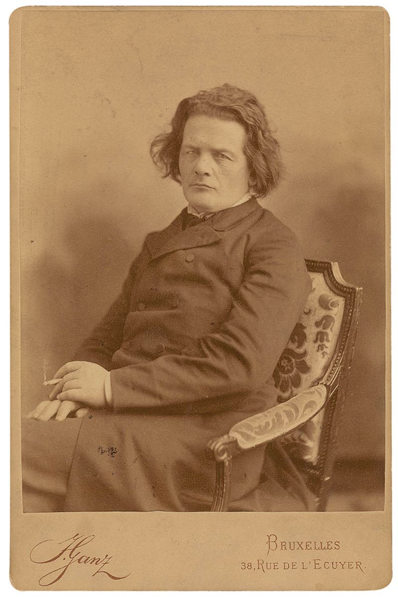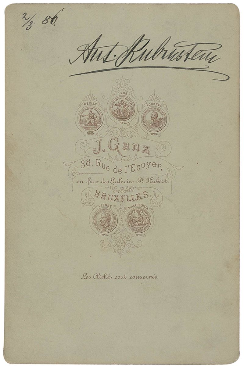 Russian pianist and composer (1829–1894) acclaimed as one of the foremost keyboard artists of all time. Original 4.25 x 6.5 cabinet photo by J. Ganz of Brussels, signed on the reverse in black ink, “Ant. Rubinstein.” Light scattered surface marks and spots to the image, some light toning and soiling, and an ink notation to the upper left corner on the reverse, otherwise fine condition.