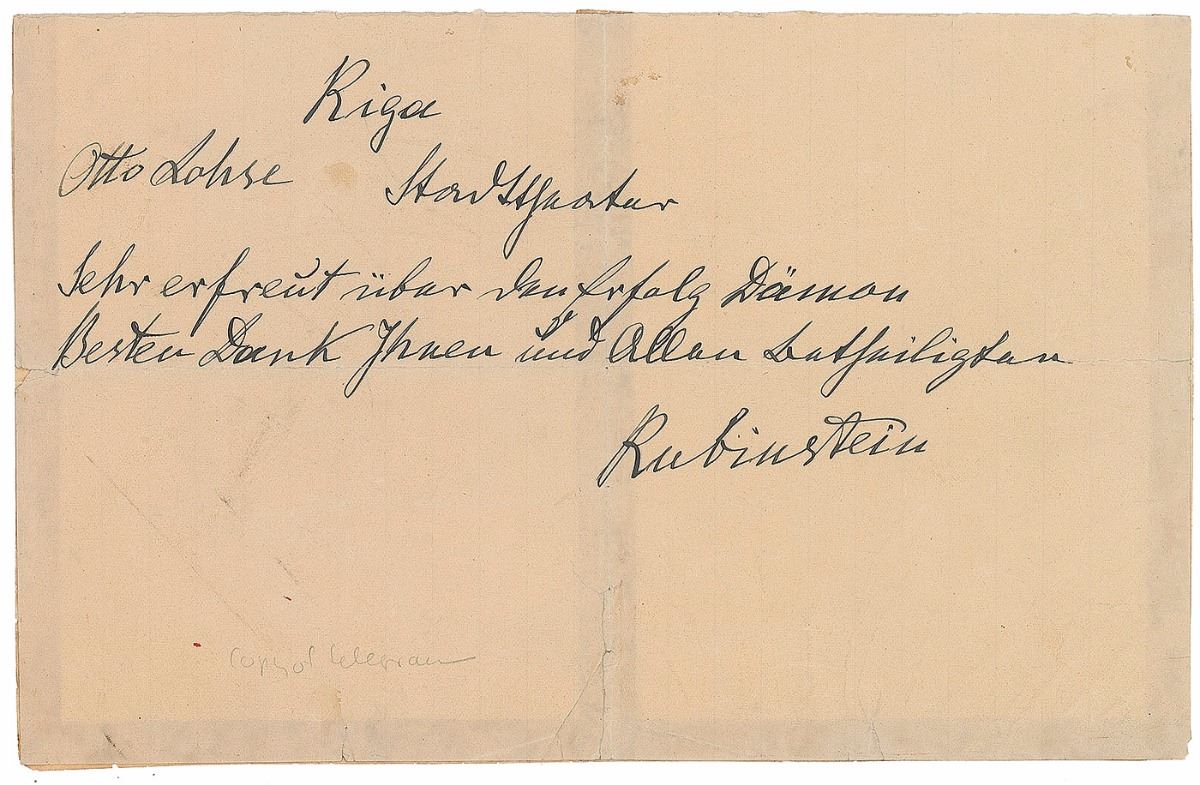ANS in German, signed “Rubinstein,” one page, 8.75 x 5.5, no date but likely circa 1893. Note to Otto Lohse at the City Theater in Riga, in full (translated): "Very pleased with the success of The Demon. Warmest thanks to you and all involved.” In very good condition, with overall wrinkling and show-through from old tape on the reverse.