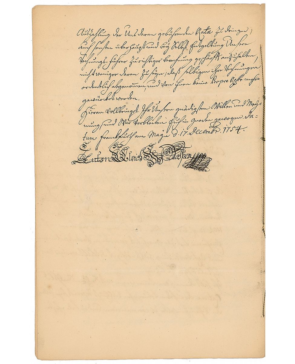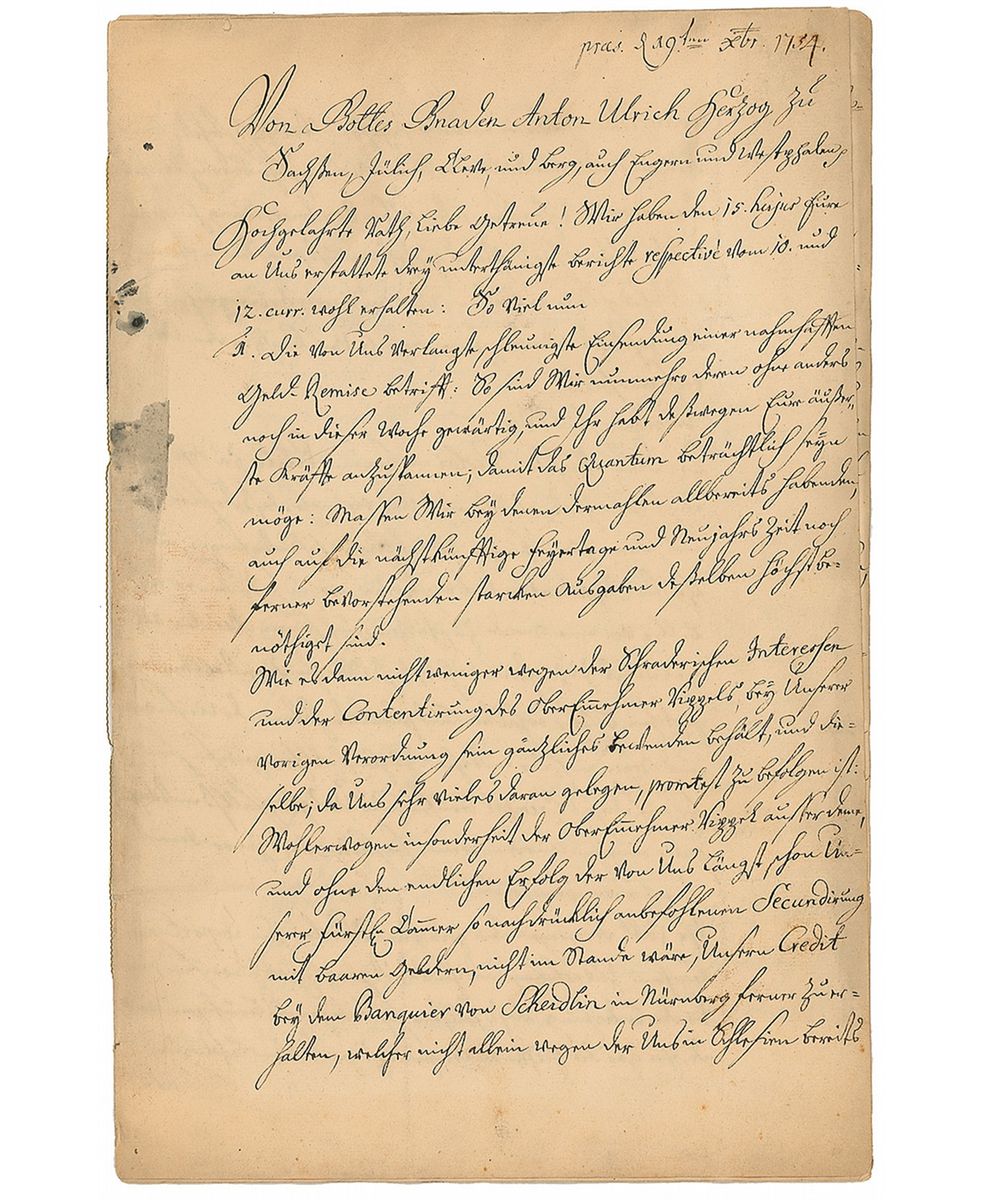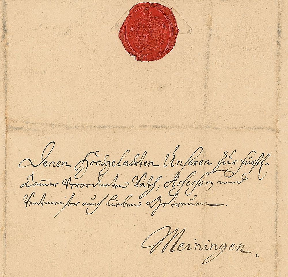 Duke of Saxe-Meiningen (1687–1783). LS in German, elaborately signed “Anton Ulrich von Sachsen,” four pages on two string-bound sheets, 9.25 x 14.5, December 17, 1754. Letter to his tax assessor and advisor. In part (translated): “Concerning the large money transfer demanded by us, send it without delay…explore all potentials…to increases the amount considerably since we need it urgently, especially in view of the coming Holidays and New Year’s weeks to cover all the coming large expenditures.” Last integral page also bears an address panel, filled out in another hand, and a red wax seal. Intersecting folds (two vertical folds passing through single letters of the signature), light overall toning, and some dampstaining to left border of first page, otherwise fine condition.