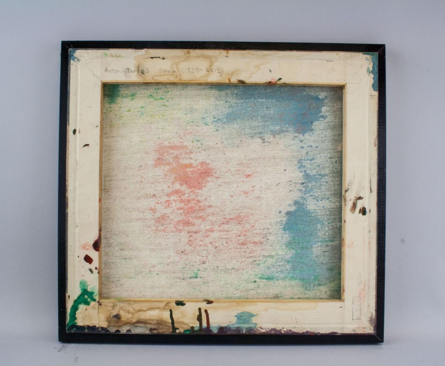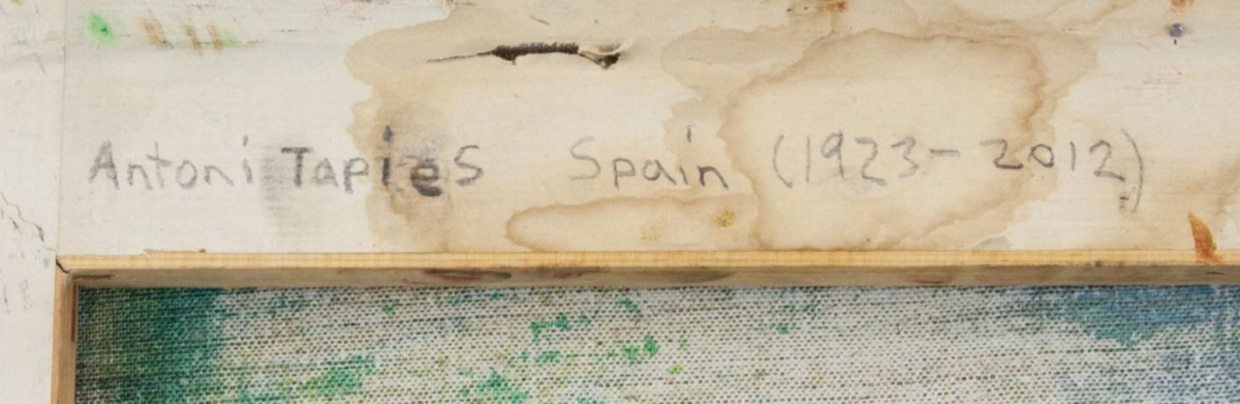 Oil on canvas. Featuring abstract expressionist composition. Signed Tapies on the lower right corner. Attributed to Antoni Tapies (1923-2012, Spanish). 19.5 x 15 inches.