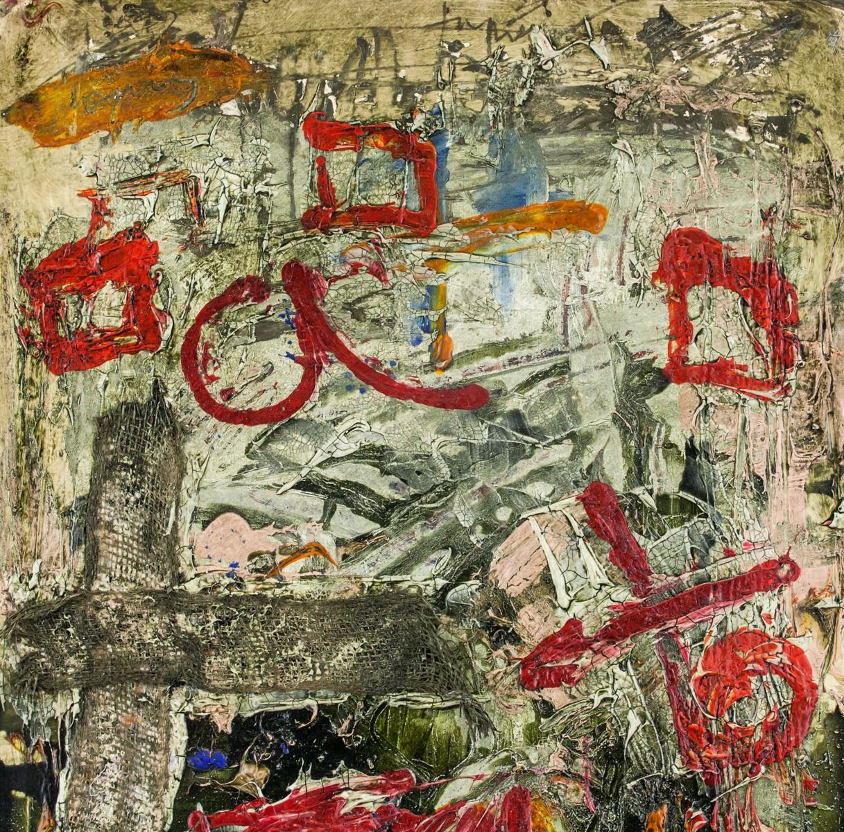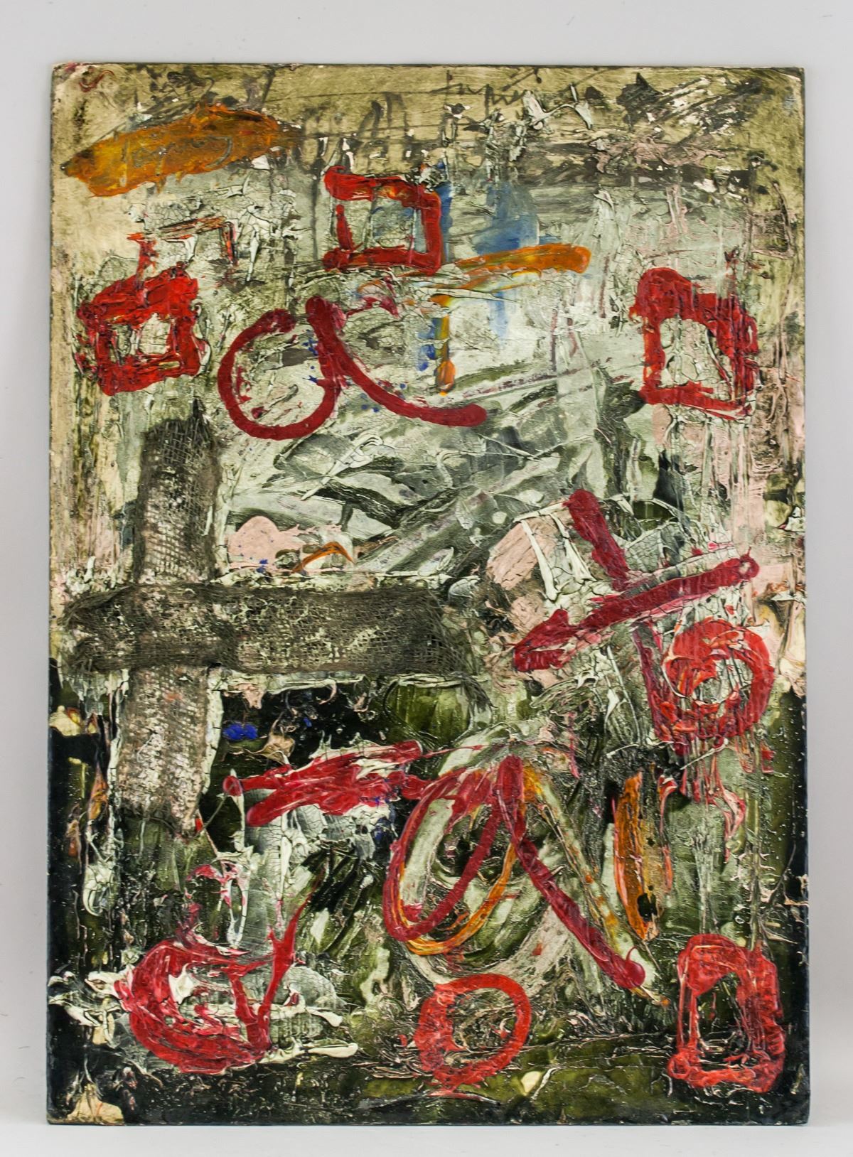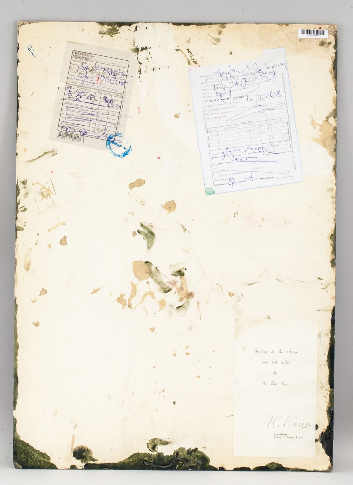Mixed media on paper board. Catalog card label affixed to verso with illegible inscriptions. Another card with open card inscriebd Greetings of the Season with best wishes for the New Year, signed K Kona, President, Houes of Councillors. Attributed to Antoni Tapies (1923-2012, Spanish). 65.5 x 47 cm (25.8 x 18.5 inches)