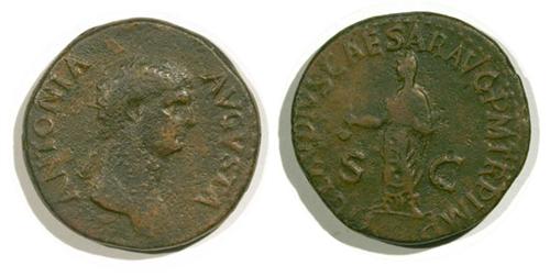 Antonia, wife of Nero Claudius Druses Dupondius. Reverse; Claudius standing left holding simpulum. Very Scarce #S1902.