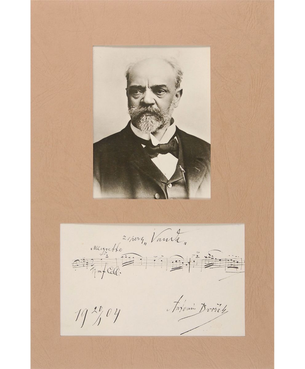 Esteemed Czech composer (1841–1904) of orchestral and chamber music, best known for his Symphony No. 9, ‘From the New World.’ Bold AMQS on an off-white 6 x 4.25 sheet. Dvorak pens eight intricate bars from his opera ‘Vanda,’ signing underneath, “Antonin Dvorak, 20/1 1904.” Matted with a portrait of Dvorak to an overall size of 7.75 x 11.5. In fine condition. A supremely desirable musical quotation by the preeminent modern composer.