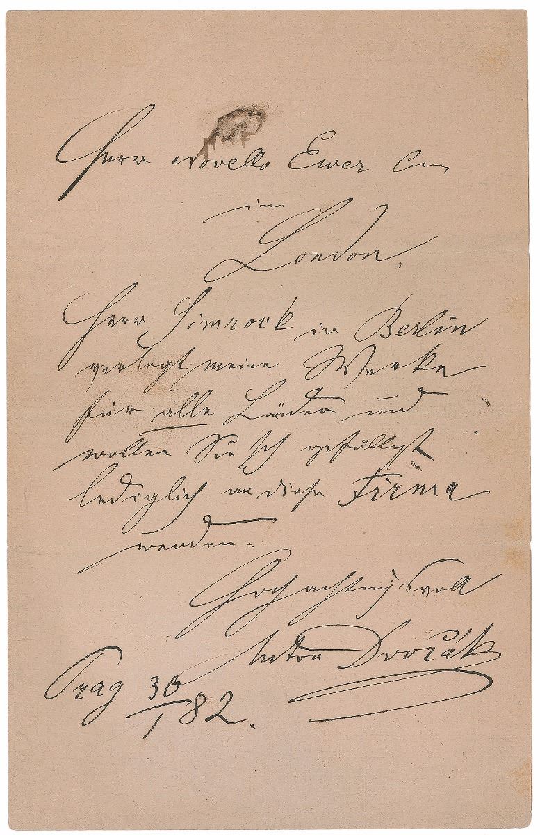 Dvorak was still a relatively unknown composer when publisher Fritz Simrock, upon receiving a recommendation from Brahms, decided to print his work. The first of these, the Moravian Duets in 1878, met immediate success and Simrock commissioned a second piece; this developed into the Slavonic Dances, which established Dvorak’s reputation internationally. Although they were friends, Dvorak and Simrock occasionally quarreled—particularly over financial matters—which caused the composer to reach out to other publishers. One major example came eight years after this letter, when Dvorak had Novello published his Symphony No. 8, which is considered one of his major achievements. Other important works published by Novello were The Spectre’s Bride, Saint Ludmila, Requiem and Mass in D major. A fantastic letter concerning his work from the early stages of his international acclaim.