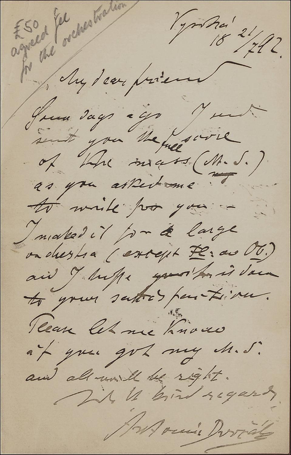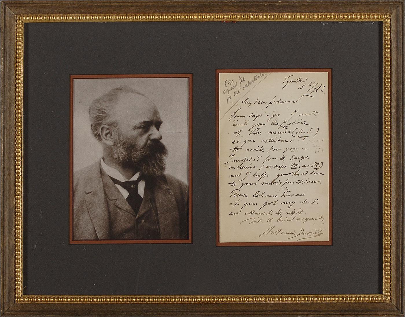 ALS in English, one page, 4.25 x 6.75, July 1892. Dvorak writes from Vysoká [Czechoslovakia] to an unnamed “Dear Friend.” In part: “Some days ago I sent you the full score of the mass (M.S.) as you asked me to write for you. I maked [sic] it for a large orchestra (except Fl: and Ob.) and I hope it is done to your satisfaction. Please let me know if you got my M.S. and all will be right.” Matted and framed, with a portrait to an overall size of 16.25 x 13. Recipient’s pencil notation to top left corner (”£50 agreed fee for the orchestration”), light mirroring of text from premature folding, and some mild toning and creasing, otherwise fine condition. Dvorak originally completed his Mass in D major in 1887. In 1892, the year of this correspondence, he expanded the instrumentation for a concert in London which took place the following March. The recipient of the letter was possibly composer Berthold Tours, who prepared the new arrangement for publication. Around the time of this letter, Dvorak was preparing to travel to the United States to assume the position of director of he National Conservatory in New York. The founder had hoped that the addition of Dvorak would help create an American musical tradition—one that the relatively ‘young’ United States was lacking in comparison to the institutions enjoyed by Europe.
