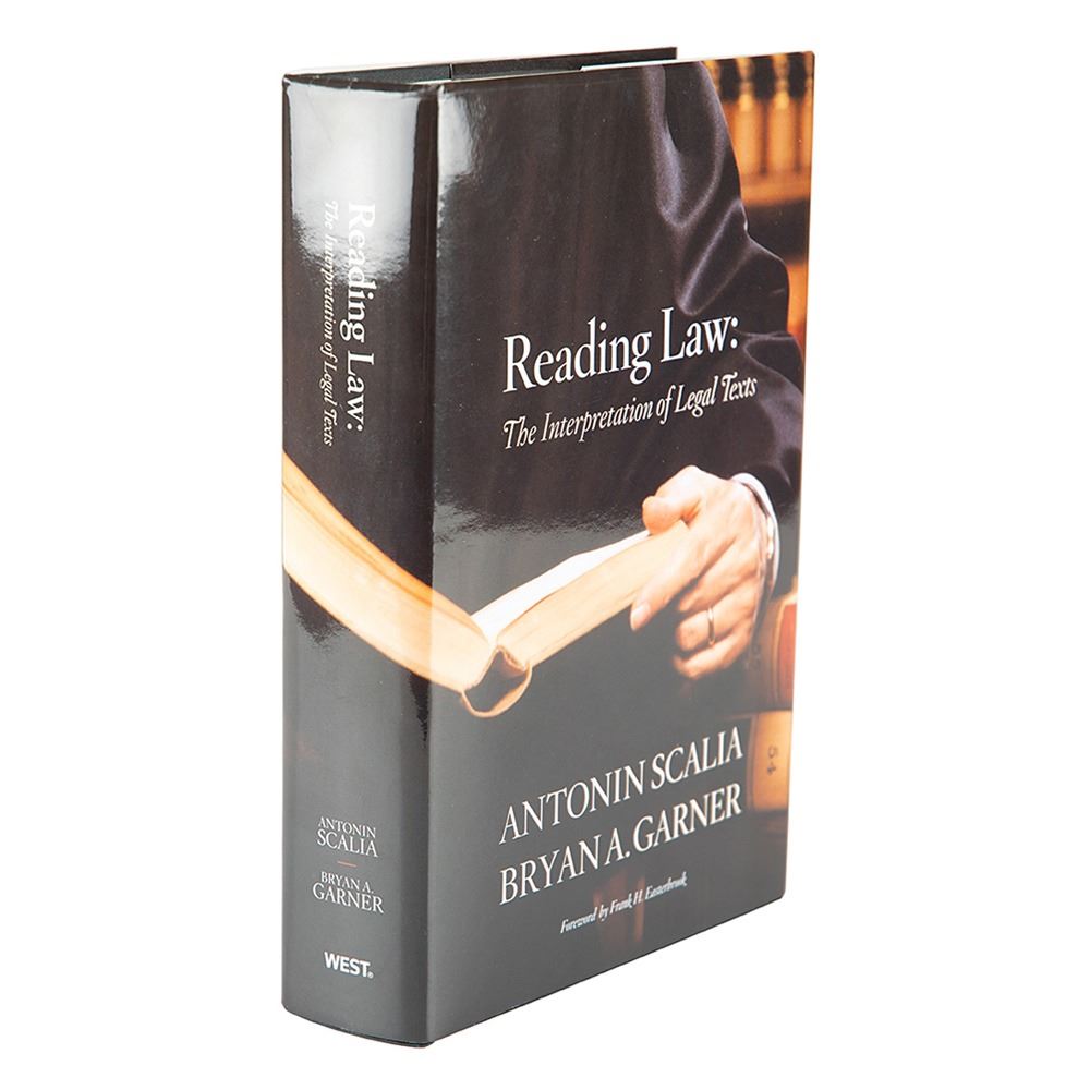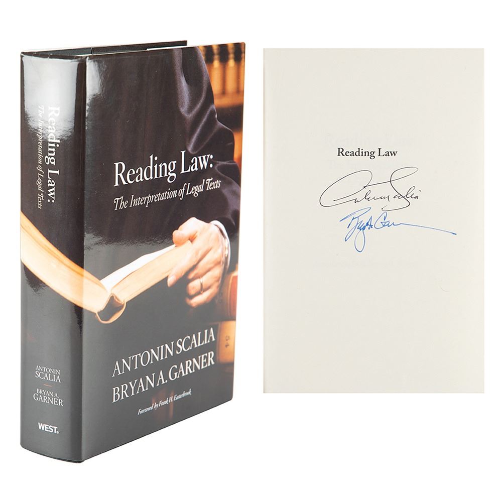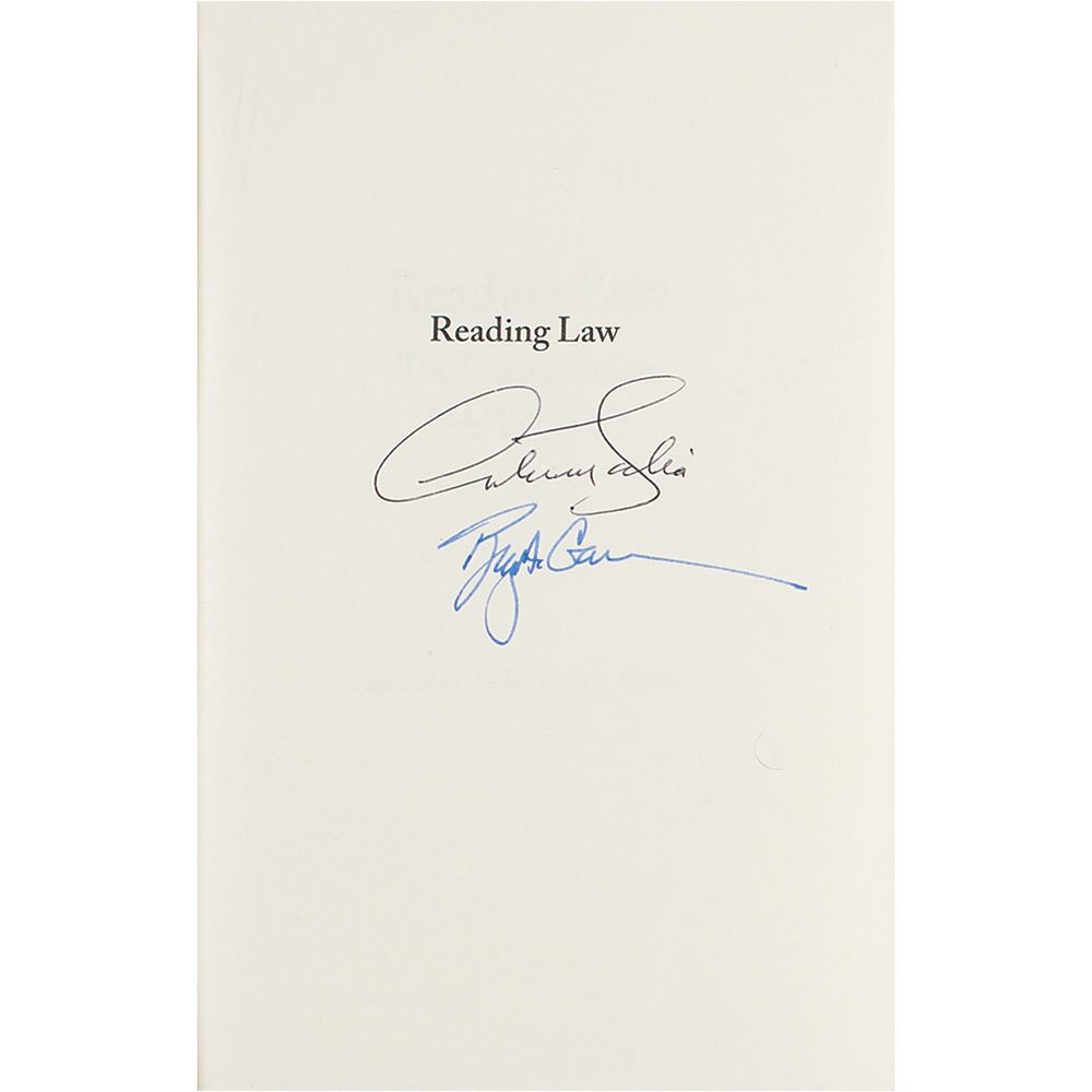 Signed book: Reading Law: The Interpretation of Legal Texts. First edition, first printing. St. Paul, MN: Thomson/West, 2012. Hardcover with dust jacket, 6.25 x 9.25, 567 pages. Signed on the half-title page in blue and black ink by Antonin Scalia and his co-author Bryan Garner. In fine condition.