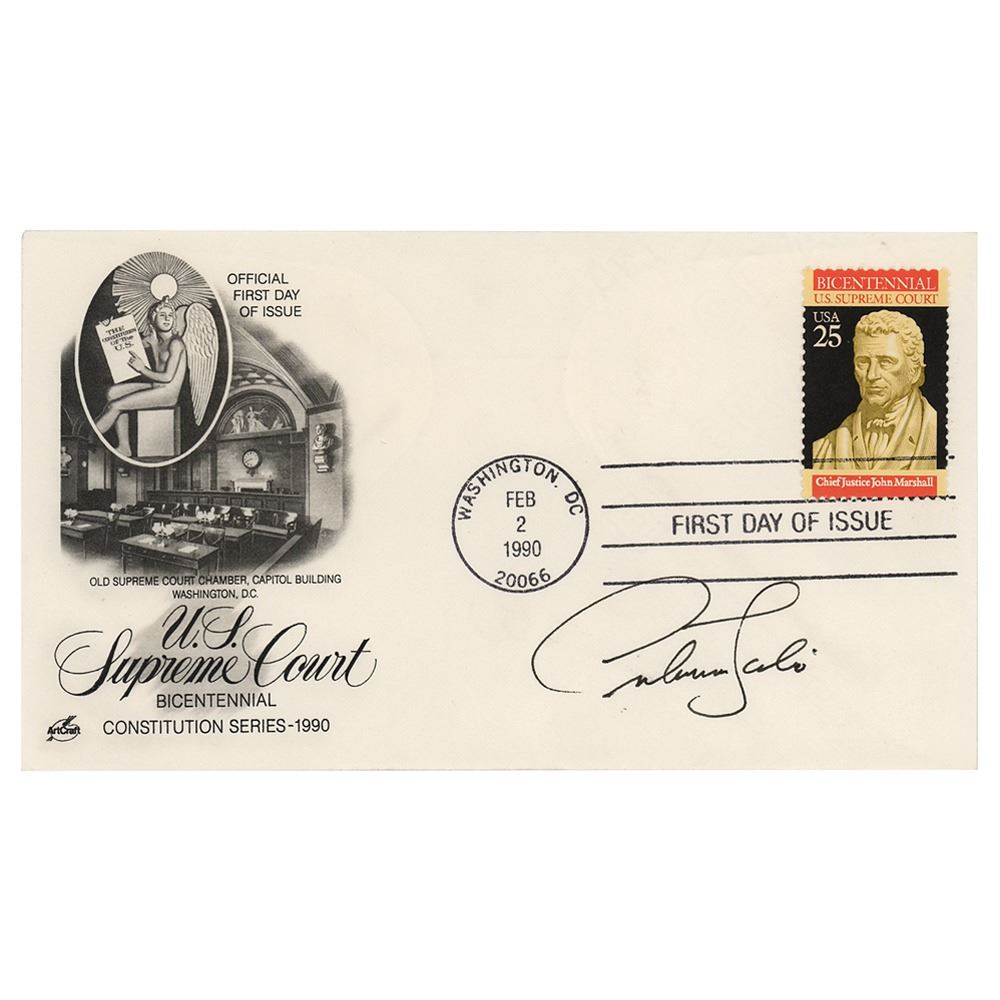 FDC with a cachet honoring the United States Supreme Court, signed in black felt tip by Antonin Scalia. In very fine condition.