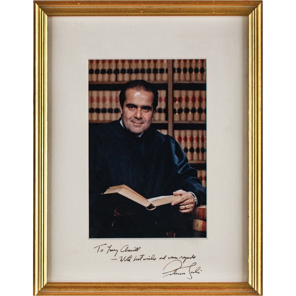 Color satin-finish 4.5 x 6.5 photo of Scalia in his judicial robes, displayed in an 8 x 10 mat, signed and inscribed on the mat in black felt tip, "To Larry Averill—With best wishes and warm regards, Antonin Scalia." Framed and in very fine condition.