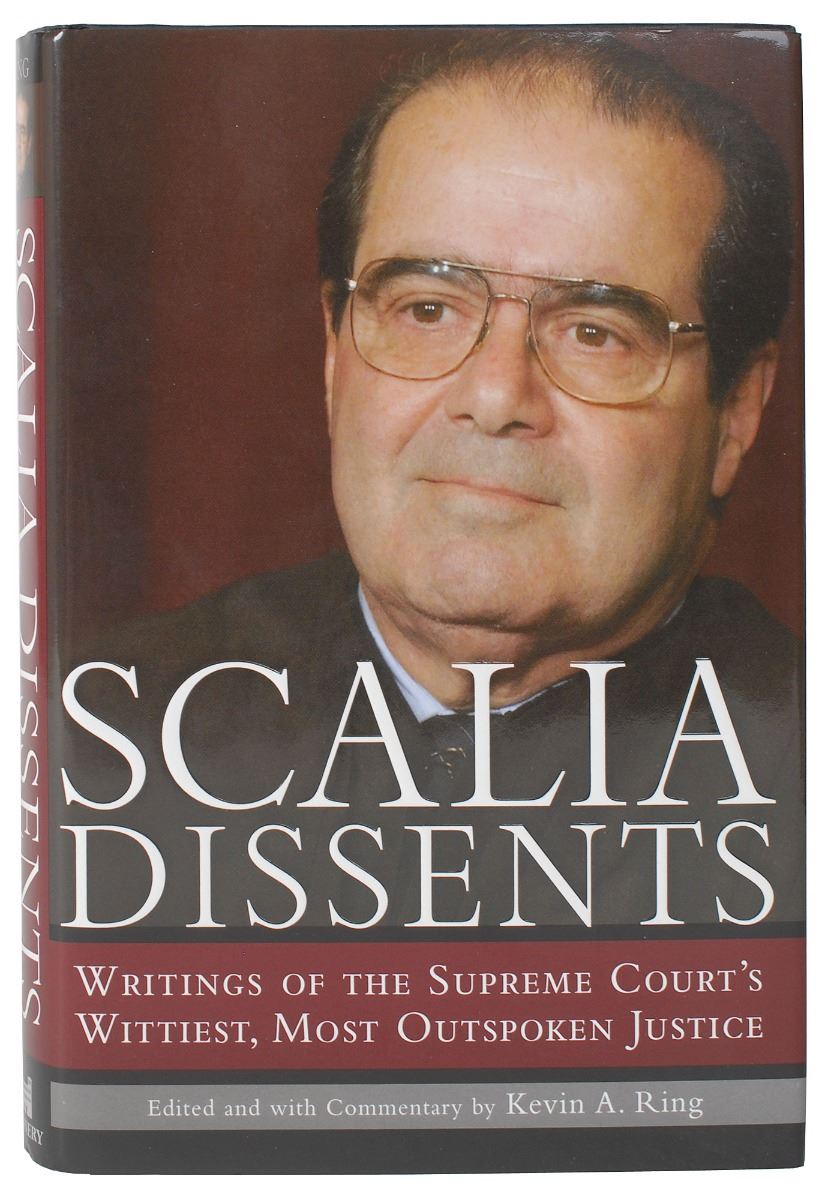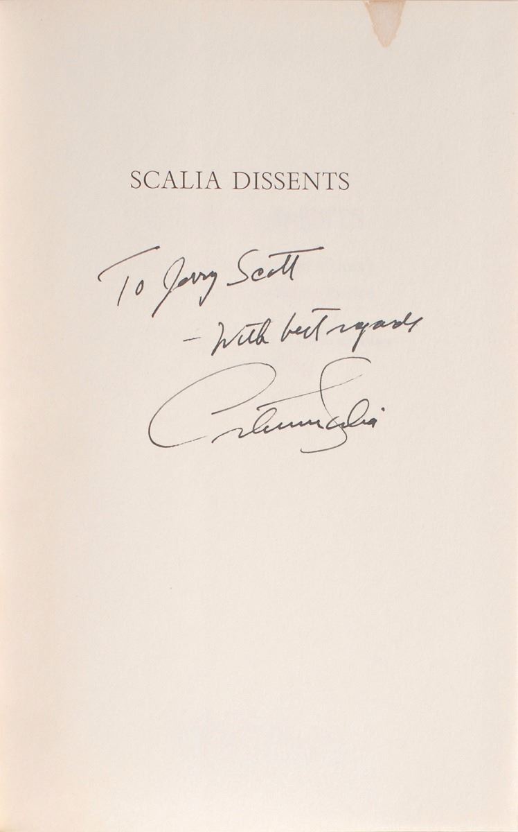 Signed book: Scalia Dissents. First edition. Washington, DC: Regnery Publishing, 2004. Hardcover with dust jacket, 6.25 x 9.25, 338 pages. Signed and inscribed on the half-title page in black ink, “To Jerry Scott—with best regards, Antonin Scalia.” In fine condition, with a small stain to top edge of signed page.