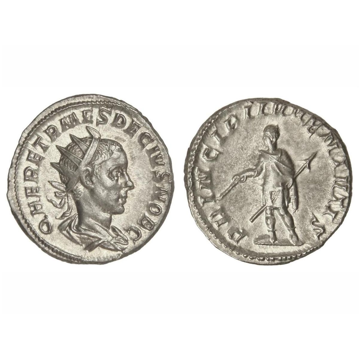 Antoninano. - Acuñada el 250-251 d.C. - HERENNIO ETRUSCO. - Rev.: PRINCIPI IVVENTVTIS. Herennio en pie a izquierda. 4,38 grs. AR. C-26. EBC+/EBC. - -