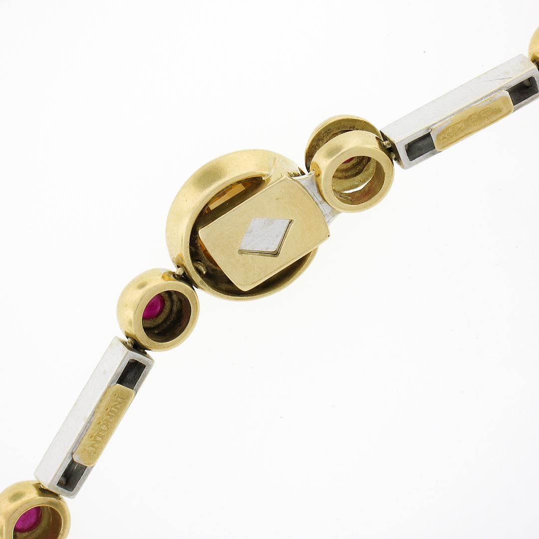 A solid 18k two tone gold fancy link necklace by Antonini, with 6 round checkerboard natural citrines ((1) 15.5mm and (5) 9.5mm each), 14 round cabochon cut natural rubies (), and 24 round brilliant cut natural diamonds (E/F - VS1/VS2 ; 1.00ctw). It weighs a total of 49.36 grams, measures 19.25mm wide, and measures 16.5 inches in length.