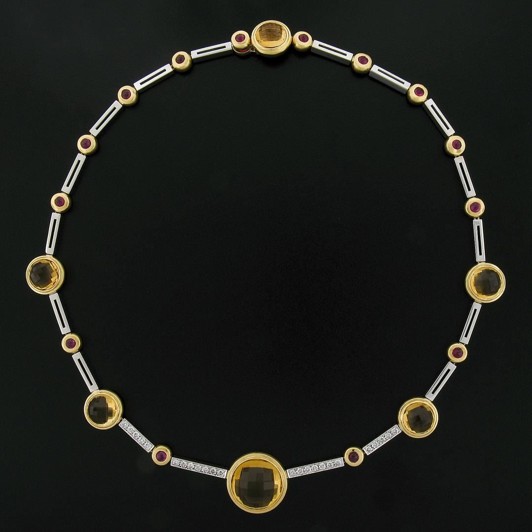 A solid 18k two tone gold fancy link necklace by Antonini, with 6 round checkerboard natural citrines ((1) 15.5mm and (5) 9.5mm each), 14 round cabochon cut natural rubies (), and 24 round brilliant cut natural diamonds (E/F - VS1/VS2 ; 1.00ctw). It weighs a total of 49.36 grams, measures 19.25mm wide, and measures 16.5 inches in length.