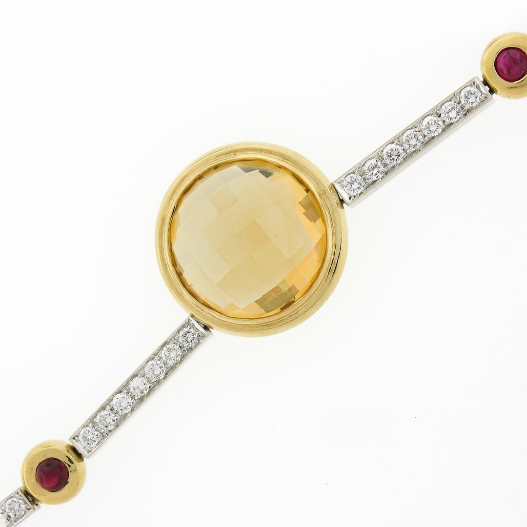 A solid 18k two tone gold fancy link necklace by Antonini, with 6 round checkerboard natural citrines ((1) 15.5mm and (5) 9.5mm each), 14 round cabochon cut natural rubies (), and 24 round brilliant cut natural diamonds (E/F - VS1/VS2 ; 1.00ctw). It weighs a total of 49.36 grams, measures 19.25mm wide, and measures 16.5 inches in length.