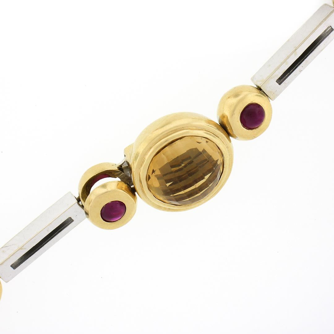 A solid 18k two tone gold fancy link necklace by Antonini, with 6 round checkerboard natural citrines ((1) 15.5mm and (5) 9.5mm each), 14 round cabochon cut natural rubies (), and 24 round brilliant cut natural diamonds (E/F - VS1/VS2 ; 1.00ctw). It weighs a total of 49.36 grams, measures 19.25mm wide, and measures 16.5 inches in length.