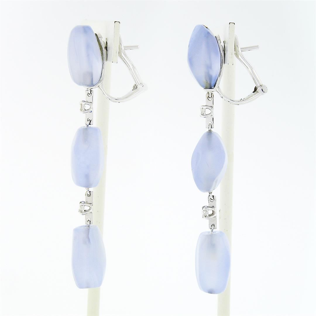 A solid 18k white gold long dangle drop earrings by Antonini, featuring 6 freeform faceted bead cabochon cut natural chalcedony (14.1x9.5mm), and 4 round brilliant cut natural diamonds (G/H - VS1/VS2 ; 0.15ctw). The earrings height measure approximately 61.80mm and weigh a total of 15.10 grams.