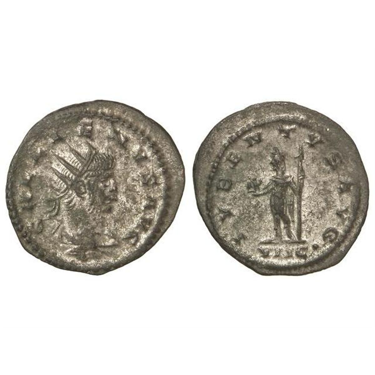 Antoniniano. - 253-268 d.C. - GALIENO. - Rev.: IVBENTVS AVG. VII C. Galieno en pie a izquierda con lanza y Victoria. 2,50 grs. AE. Plateado original. C-415. EBC-. - -