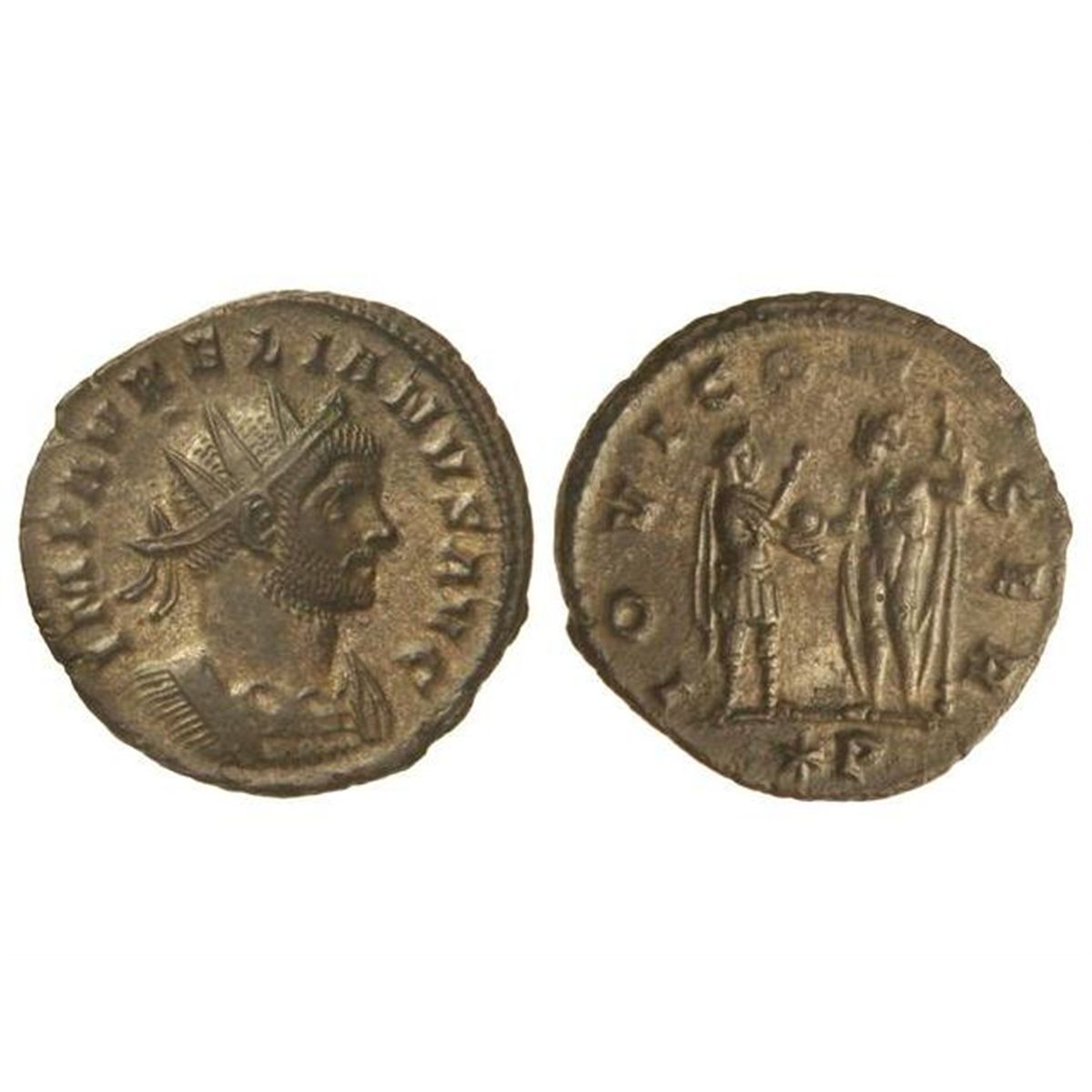 Antoniniano. - 270-275 d.C. - AURELIANO. - Rev.: IOVI COMSER. Aureliano en pie a derecha con cetro y lanza, recibiendo un globo que le ofrece Júpiter. 3,8 grs. AE. C-105. EBC-. - -