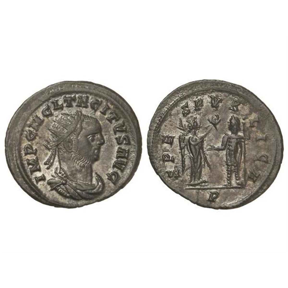 Antoniniano. - 275-276 d.C. - TÁCITO. - Rev.: SPES PVBLICA. Victoria en pie a derecha con palma ofreciendo una guirnalda a Tácito en pie frente a ella con cetro. 3,70 grs. C-466. EBC. - -