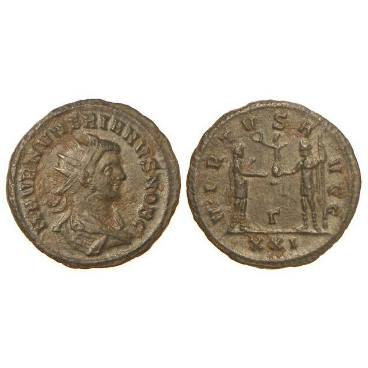 Antoniniano. - 283-284 d.C. - NUMERIANO. - Rev.: VIRTVS AVGG. Numeriano en pie a derecha recibiendo Victoria sobre un globo, ofrecida por Júpiter. 3,50 grs. AE. Pátina oscura. C-107. MBC. - -