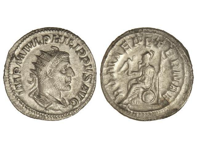 Antoniniano. Acuñada el 244-247 d.C. FILIPO I. Rev.: ROMAE AETERNAE. Roma sentada a izquierda con cetro y Victoria. 3,80 grs. AR. C-169. MBC+.